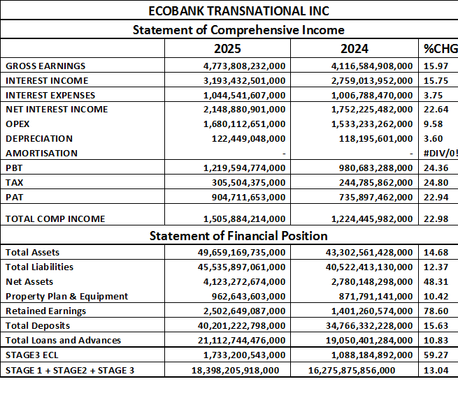 Opinion/Findings: Ecobank Transnational Incorporated (ETI) delivered a strong overall financial performance in 2025, supported by robust earnings growth, improved net interest income, and better cost efficiency. The bank also strengthened its capital base significantly, as seen in the growth in equity and retained earnings, while maintaining positive operating leverage. However, this performance is somewhat tempered by rising credit risk, evidenced by the increase in non-performing loans and Stage 3 exposures, as well as a slight decline in key profitability metrics such as ROE and EBIT margin. Nonetheless, the reintroduction of dividend payments signals management confidence and improved earnings stability.