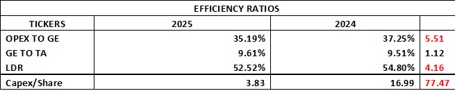 A notable development in the group during the period is the sharp decline in Capex per Share to 3.83 from 16.99, representing a significant reduction of 77.47%. This suggests that the bank scaled back its capital expenditure during the period, possibly after prior heavy investments or as part of cost optimization efforts. While this supports short-term efficiency and cash flow preservation, sustained underinvestment could impact long-term growth if not balanced properly. Overall, ETI shows improved cost efficiency and stable asset utilization, though its conservative lending approach and reduced capital expenditure require close monitoring.