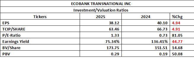Ecobank Transnational Incorporated (ETI) presented mixed signals in its investment and valuation profile for 2025. Earnings Per Share (EPS) declined by 4.94% to N38.12, while Total Comprehensive Income per share also fell by 4.91%, indicating a slight dilution in per-share performance despite the improvement in absolute profit growth which may be attributed to an expanded share base or retained earnings accumulation. However, Book Value per Share (BVPS) increased by 14.68% to N173.75, reflecting strengthened shareholders’ equity and improved intrinsic value of the bank.