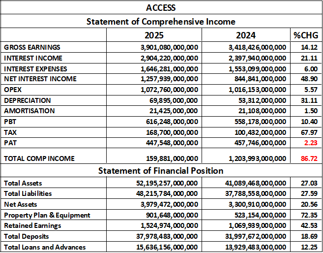 At the end of the 2025 nine-month period, the management of Access Holdings reported a Gross Earnings of N3.901 trillion, which is 14.12% above the N3.418 trillion reported at the end of the similar quarter in 2024. Interest Income stood at N2.904 trillion versus N2.397 trillion in the prior nine-month. Interest Expenses is valued at N1.646 trillion, as against N1.553 trillion in the corresponding quarter of 2024.