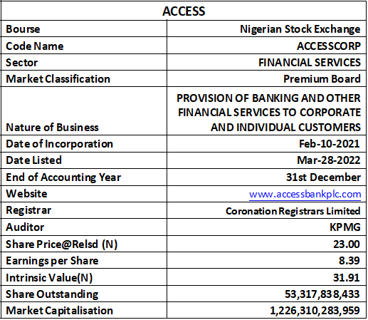 Access Holdings’ business segments comprise of deposit money banking, wealth and investment management, financial technology and ecosystem orchestration, while its operating and direct subsidiaries are Access Bank Plc (core banking), Hydrogen Payment Services Company Limited (payment services), Oxygen X Finance Company Limited (consumer lending) and Access Insurance Brokers Limited (insurance brokerage). Access Golf Limited is a Special Purpose Vehicle for Access Holdings equity investment in its indirect subsidiary, Access ARM Pension Limited (pension funds administration).