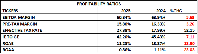 - Debt Ratio: Access Holdings’ debt ratio means that over 92% of Total Assets are financed by liabilities, which is normal for banks/holding companies with a large banking arm. The slight increase from 91.97% to 92.38% indicates a marginal rise in leverage, meaning that the institution is relying more on borrowed funds.