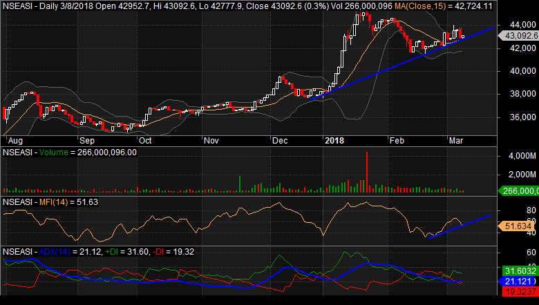 Technically, the NGX is in a markup phase in the midst of recovery and volatility, as candlestick formation and momentum indicators reveal a somewhat strength and weakness in the market. ADX looking down to read 28.66 points, while RSI and Money Flow Index were up at 55.97 and 45.30 points against the previous session’s 49.88 and 38.96 points respectively. Consequently, market players should watch this current trend and trade wisely in the face of funds entering the market on a buying sentiment in some sectors and profit taking in others. Also, trading volume pattern continued to oscillates, suggesting buying interest and selloffs in the market amid players revaluing the market and policy direction of the government that look confused.