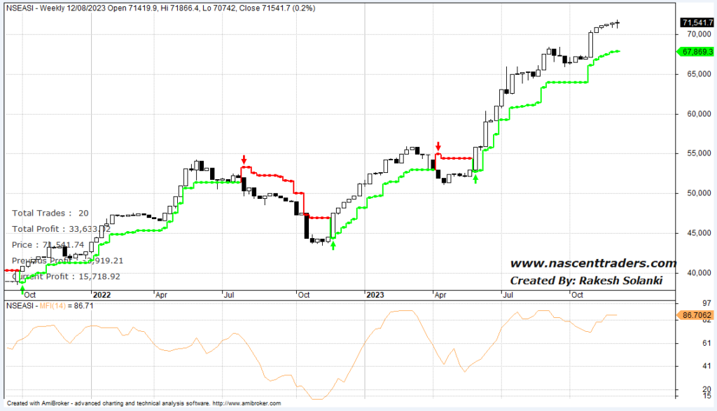 Nigeria’s equity market witnessed another positive outing, despite a mixed performance over the past week, as the composite index NGXASI extended its bullish run for the seven consecutive weeks of buying sentiment and positive momentum. Transaction volume was above average even as the index made a new all-time high, pulling back on profit taking that hit highly priced stocks, even while resisting further decline as revealed by Friday’s candlestick formation to trade above the T-line. The momentum indicators on a weekly time frame remained strong as the OBV and EMA 20 signaled the fact that yet another rally is underway before the year 2023 draws to a close, but on a ranging market or consolidating move that calls for cautious trading.