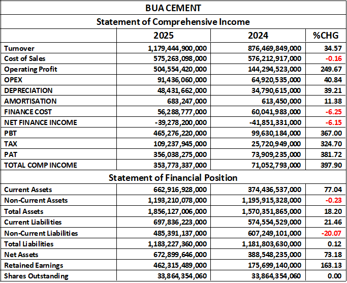 According to the full year 2025 business performance presented, the management of BUA Cement announced a Turnover of N1.179 trillion over the previous year’s N879.469 billion. Despite this large improvement, Direct Cost of Sales dropped marginally to N575.263 billion from N576.212 billion announced in the previous full-year. Operating Profit is valued at N504.554 billion from N144.294 billion, while Operating Expenses less Depreciation and Amortisation stood at N91.436 billion versus N64.920 billion in the previous year. Finance Cost stood at N56.288 billion from N60.041 of comparable year, while Net Finance Cost remained negative at N39.278 billion, from N41.851 billion.