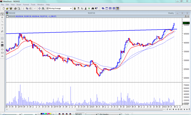 The NGX index action remains strong on a weekly and daily charts, as the index trades above the ‘T’ line on the bullish engulfing candles to almost testing the major strong resistance levels of 51,000 points on a high traded volume to trade above 20- and 50-day moving average to reveal strength. The candlestick formation, at the end of the week, showed that the market is on an uptrend, as players digest the Q1 numbers already released to reposition their portfolios for Q2. The candlestick pattern indicates a possible continuation of the trend, depending on market forces in the new week as last Friday’s trading pattern revealed profit taking is underway.