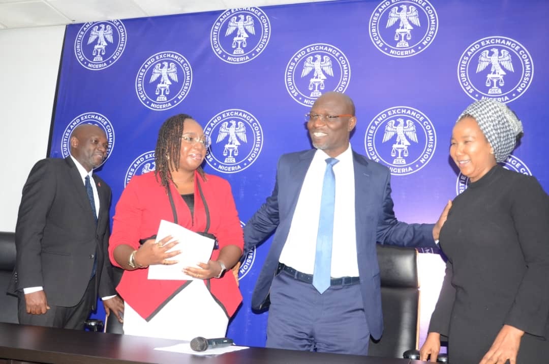 Post Views: 16 Caption: Director-General, Securities & Exchange Commission (SEC), Dr. Emomotimi Agama (second right), exchanges banters...