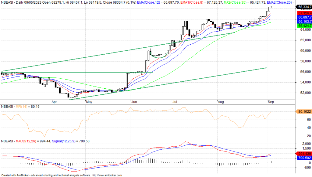 The NGX All-Share index still traded above the 68,000 basis points mark, heading towards the 1984 threshold of 70,000bps on improved transactions in volume and mixed sentiment. The candlestick formation at the end of Tuesday’s session signaled a top reversal pattern as the 2008 resistance level turn support to reveal a markup phase. Also, the market continues to interpret and digest the latest news about Oando’s acquisition of the entire shareholding of Agip’s assets and the planned delisting of PZ Cussons announced on the Exchange ahead of its expected full-year audited financial s for May 30, 2023.