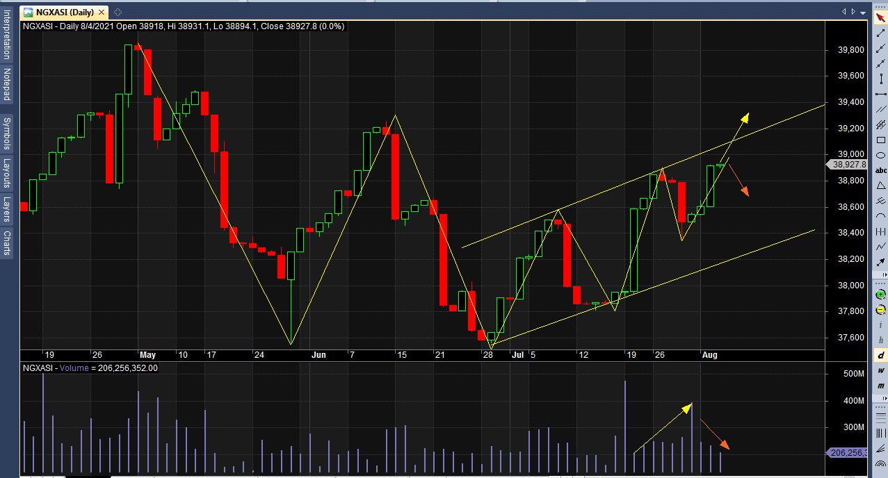 Meanwhile, the NGX index action seems to be struggling after breaking out the recent resistance level on a low traded volume and sluggish uptrend as observed at the end of midweek’s trading, after more than 96% of the companies with December year-end had made their half-year financials available to the market. So investors digest these numbers and sector rotation continue, market players should not panic but trade with caution and build their tent in fundamentally sound stocks with growth prospects.