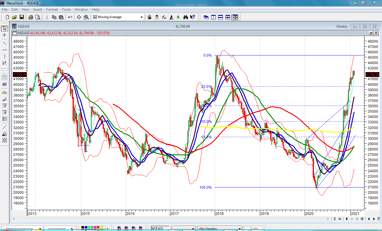 The NSE’s index action was bearish and volatile during the week on a mixed sentiments, as discerning investors accumulates position among dividend paying stocks ahead of the release of 2020 financials in this month and next. Also, the index is trading above the seven, 50 and 200-Day Moving Average, despite breaking down the 42,000 mark strong support level on a high traded volume and mixed sentiments. This is likely to reverse as more players’ position for the rest of the month in expectation of earnings.