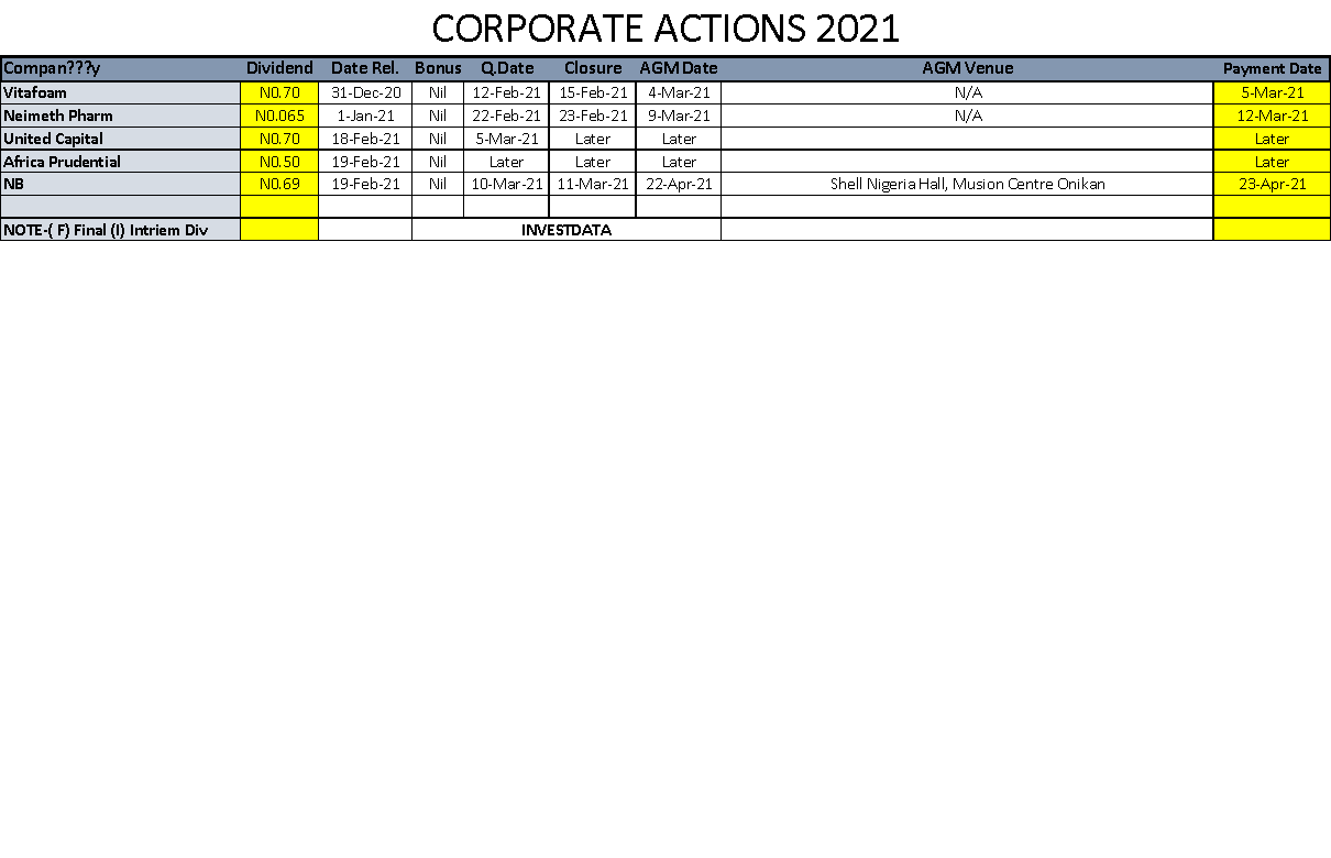 Equities Corporate Actions As Of Friday, February 19, 2021 Editor February 20, 2021 1 min read 210 Post Views: 751 Continue Reading Previous: Report: Hit By China’s Flu, Nigeria’s Oil/Gas Stocks Face 2020 Full-Year LossNext: Mixed Week Ahead As Investors Reposition Portfolios Ahead Of Earnings Season, Div Trending Now SEC Nigeria Mulls Green Energy Bonds, PPPs To Tackle National Power Sector Challenges 1 SEC Nigeria Mulls Green Energy Bonds, PPPs To Tackle National Power Sector Challenges January 1, 2026 NGX Closes 2025 Strong As Late Buying Lifts Banking Stocks, Market Breadth Improves 2 NGX Closes 2025 Strong As Late Buying Lifts Banking Stocks, Market Breadth Improves December 31, 2025 Presco Plc Says 103% Rights Issue Subscription Level Sign Of Strong Investor Confidence 3 Presco Plc Says 103% Rights Issue Subscription Level Sign Of Strong Investor Confidence December 31, 2025 Oil Prices Hold Steady On Tuesday Amid Global Tensions 4 Oil Prices Hold Steady On Tuesday Amid Global Tensions December 31, 2025 Nigerian Equities Sustain Rally As Liquidity, Sector Rotation Support Gains 5 Nigerian Equities Sustain Rally As Liquidity, Sector Rotation Support Gains December 30, 2025 UPDC 2025-9months: It’s a Hold, Amid Rising Profit, Shrinking Margins, Galloping Share Price Post-Turnaround 6 UPDC 2025-9months: It’s a Hold, Amid Rising Profit, Shrinking Margins, Galloping Share Price Post-Turnaround December 30, 2025 Related Stories NGX Closes 2025 Strong As Late Buying Lifts Banking Stocks, Market Breadth Improves 5 min read Equities NGX Closes 2025 Strong As Late Buying Lifts Banking Stocks, Market Breadth Improves December 31, 2025 84 Nigerian Equities Sustain Rally As Liquidity, Sector Rotation Support Gains 5 min read Equities Nigerian Equities Sustain Rally As Liquidity, Sector Rotation Support Gains December 30, 2025 121 Nigerian Stocks Extend Santa Claus Rally As Composite Index Hits Fresh High 5 min read Equities Nigerian Stocks Extend Santa Claus Rally As Composite Index Hits Fresh High December 29, 2025 228 Corporate Actions On Nigerian Bourse As Of Wednesday, December 24, 2025 1 min read Equities Corporate Actions On Nigerian Bourse As Of Wednesday, December 24, 2025 December 27, 2025 181 NGX Ends Christmas Eve Higher As Banking, Consumer Stocks Advance 5 min read Equities NGX Ends Christmas Eve Higher As Banking, Consumer Stocks Advance December 24, 2025 289 NGX Sustains Bullish Momentum As Buying Pressure Keeps Market On The Upside 5 min read Equities NGX Sustains Bullish Momentum As Buying Pressure Keeps Market On The Upside December 23, 2025 217