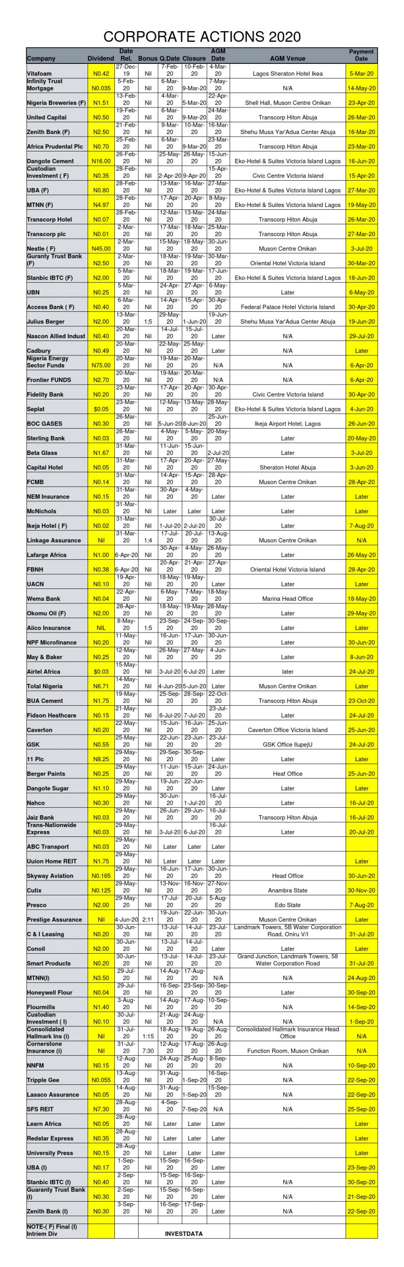 Equities Corporate Actions On NGSE As Of Friday, September 4, 2020 Editor September 5, 2020 1 min read 240 Post Views: 473 Continue Reading Previous: Analysts Upbeat As Investors Digest Half-Year Reports Of Interim Div Paying BanksNext: Mixed Outlook On NGSE, Investors Should Diversify Portfolios, Protect Capital Trending Now NGX Ends Bearish On Heavyweight Selloffs Amid Cautious Sentiment 1 NGX Ends Bearish On Heavyweight Selloffs Amid Cautious Sentiment January 23, 2026 Oil Slides as Geopolitical Tensions Ease, But Supply Concerns Linger 2 Oil Slides as Geopolitical Tensions Ease, But Supply Concerns Linger January 23, 2026 BUA Cement, CBMI Seal US$240m Deal For 3mtpa Sokoto Plant Expansion In 20 Months 3 BUA Cement, CBMI Seal US$240m Deal For 3mtpa Sokoto Plant Expansion In 20 Months January 22, 2026 Cautious Bargain Hunting Lifts Equities Marginally Amid Mixed Sector Performance 4 Cautious Bargain Hunting Lifts Equities Marginally Amid Mixed Sector Performance January 22, 2026 Oil Prices Tick Up On Kazakhstan Supply Disruptions 5 Oil Prices Tick Up On Kazakhstan Supply Disruptions January 22, 2026 Nigerian Equities Post Modest Rebound As Bargain Hunting, Oil Strength Support Market 6 Nigerian Equities Post Modest Rebound As Bargain Hunting, Oil Strength Support Market January 21, 2026 Related Stories NGX Ends Bearish On Heavyweight Selloffs Amid Cautious Sentiment 2 min read Equities NGX Ends Bearish On Heavyweight Selloffs Amid Cautious Sentiment January 23, 2026 127 Cautious Bargain Hunting Lifts Equities Marginally Amid Mixed Sector Performance 3 min read Equities Cautious Bargain Hunting Lifts Equities Marginally Amid Mixed Sector Performance January 22, 2026 141 Nigerian Equities Post Modest Rebound As Bargain Hunting, Oil Strength Support Market 3 min read Equities Nigerian Equities Post Modest Rebound As Bargain Hunting, Oil Strength Support Market January 21, 2026 184 Nigerian Equities End Flat-To-Bearish As Profit Taking Offsets Broad Buying, Composite Index Holds Key Support 3 min read Equities Nigerian Equities End Flat-To-Bearish As Profit Taking Offsets Broad Buying, Composite Index Holds Key Support January 20, 2026 192 Corporate Actions On The Nigerian Bourse As Of Friday, January 16, 2026 1 min read Equities Corporate Actions On The Nigerian Bourse As Of Friday, January 16, 2026 January 17, 2026 177 NGX Ends Week Stronger Amid Bullish Trend Despite Profit-Taking, Ahead Of Earnings Inflow 7 min read Equities NGX Ends Week Stronger Amid Bullish Trend Despite Profit-Taking, Ahead Of Earnings Inflow January 17, 2026 224