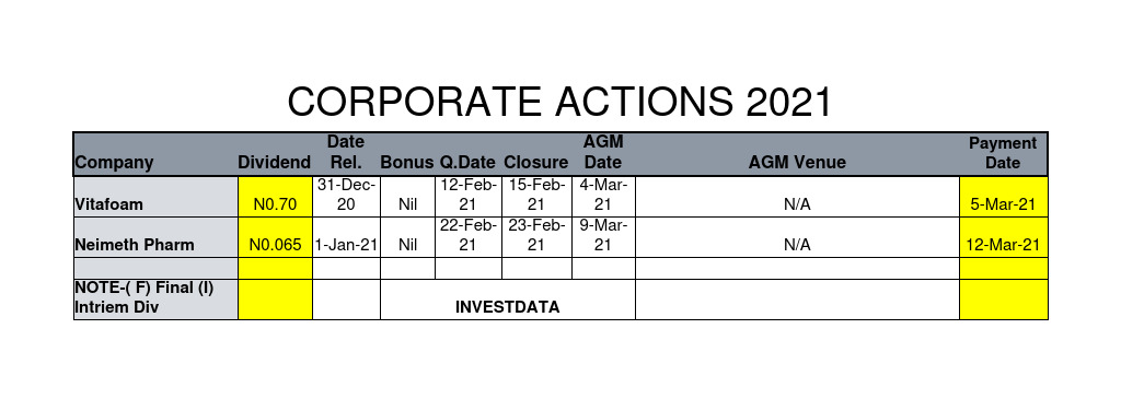 Equities Corporate Actions On NGSE As Of Friday, January 15, 2021 Editor January 16, 2021 1 min read 394 Post Views: 393 Continue Reading Previous: Investdata Price, Earnings Tracking For Week Ended January 15, 2021Next: Positive Outlook On NGSE, But Expect Profit Booking After 9 Sessions Of Gains Trending Now Nigeria’s Equity Market Opens 2026 With New High, As Post-Christmas Rally Extends AmidEarnings Expectation 1 Nigeria’s Equity Market Opens 2026 With New High, As Post-Christmas Rally Extends AmidEarnings Expectation January 4, 2026 Corporate Actions On Nigerian Bourse As Of Friday, January 2, 2026 2 Corporate Actions On Nigerian Bourse As Of Friday, January 2, 2026 January 4, 2026 Muted Oil Reaction To Mask Deeper Risk Of Venezuela Strike 3 Muted Oil Reaction To Mask Deeper Risk Of Venezuela Strike January 3, 2026 NGX Begins 2026 On Strong Footing As Selective Buying Lifts Banking, Mid-Cap Stocks 4 NGX Begins 2026 On Strong Footing As Selective Buying Lifts Banking, Mid-Cap Stocks January 3, 2026 NGX 2025 Year-End Review: Consumer Goods, Industrials Drive Historic 51% Surge, Set Stage For 2026 On Nigerian Bourse 5 NGX 2025 Year-End Review: Consumer Goods, Industrials Drive Historic 51% Surge, Set Stage For 2026 On Nigerian Bourse January 2, 2026 SEC Nigeria Mulls Green Energy Bonds, PPPs To Tackle National Power Sector Challenges 6 SEC Nigeria Mulls Green Energy Bonds, PPPs To Tackle National Power Sector Challenges January 1, 2026 Related Stories Corporate Actions On Nigerian Bourse As Of Friday, January 2, 2026 1 min read Equities Corporate Actions On Nigerian Bourse As Of Friday, January 2, 2026 January 4, 2026 43 NGX Begins 2026 On Strong Footing As Selective Buying Lifts Banking, Mid-Cap Stocks 2 min read Equities NGX Begins 2026 On Strong Footing As Selective Buying Lifts Banking, Mid-Cap Stocks January 3, 2026 107 NGX 2025 Year-End Review: Consumer Goods, Industrials Drive Historic 51% Surge, Set Stage For 2026 On Nigerian Bourse 4 min read Equities NGX 2025 Year-End Review: Consumer Goods, Industrials Drive Historic 51% Surge, Set Stage For 2026 On Nigerian Bourse January 2, 2026 261 NGX Closes 2025 Strong As Late Buying Lifts Banking Stocks, Market Breadth Improves 5 min read Equities NGX Closes 2025 Strong As Late Buying Lifts Banking Stocks, Market Breadth Improves December 31, 2025 156 Nigerian Equities Sustain Rally As Liquidity, Sector Rotation Support Gains 5 min read Equities Nigerian Equities Sustain Rally As Liquidity, Sector Rotation Support Gains December 30, 2025 165 Nigerian Stocks Extend Santa Claus Rally As Composite Index Hits Fresh High 5 min read Equities Nigerian Stocks Extend Santa Claus Rally As Composite Index Hits Fresh High December 29, 2025 252