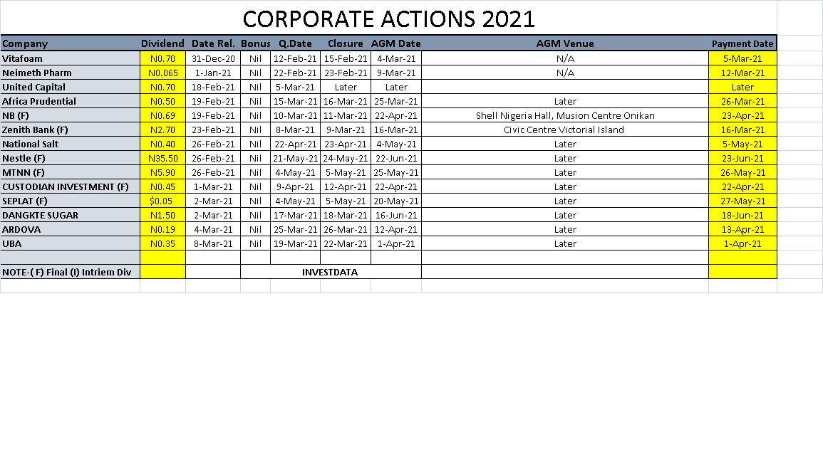 Equities Corporate Actions On NGSE As Of Friday, March 12, 2021 Editor March 13, 2021 1 min read 276 Post Views: 557 Continue Reading Previous: Investdata Price, Earnings Tracking For Week Ended March 12, 2021Next: Mixed Trend Ahead, Ahead Of Earnings, As Investors Watch Fixed Income Yields, Oil Trending Now GDP: Nigeria Operating Far Below Its Productive Capacity 1 GDP: Nigeria Operating Far Below Its Productive Capacity January 25, 2026 Nigerian Bourse Ranges On Profit Taking Ahead Earnings Expectations, Sector Rotation 2 Nigerian Bourse Ranges On Profit Taking Ahead Earnings Expectations, Sector Rotation January 24, 2026 Corporate Actions On NGX As Of Friday, January 23, 2026 3 Corporate Actions On NGX As Of Friday, January 23, 2026 January 24, 2026 NGX Ends Week On Cautious Positive Note As Selective Buying Offsets Profit-Taking Pressures 4 NGX Ends Week On Cautious Positive Note As Selective Buying Offsets Profit-Taking Pressures January 24, 2026 NGX Ends Bearish On Heavyweight Selloffs Amid Cautious Sentiment 5 NGX Ends Bearish On Heavyweight Selloffs Amid Cautious Sentiment January 23, 2026 Oil Slides as Geopolitical Tensions Ease, But Supply Concerns Linger 6 Oil Slides as Geopolitical Tensions Ease, But Supply Concerns Linger January 23, 2026 Related Stories Corporate Actions On NGX As Of Friday, January 23, 2026 1 min read Equities Corporate Actions On NGX As Of Friday, January 23, 2026 January 24, 2026 76 NGX Ends Week On Cautious Positive Note As Selective Buying Offsets Profit-Taking Pressures 3 min read Equities NGX Ends Week On Cautious Positive Note As Selective Buying Offsets Profit-Taking Pressures January 24, 2026 91 NGX Ends Bearish On Heavyweight Selloffs Amid Cautious Sentiment 2 min read Equities NGX Ends Bearish On Heavyweight Selloffs Amid Cautious Sentiment January 23, 2026 173 Cautious Bargain Hunting Lifts Equities Marginally Amid Mixed Sector Performance 3 min read Equities Cautious Bargain Hunting Lifts Equities Marginally Amid Mixed Sector Performance January 22, 2026 171 Nigerian Equities Post Modest Rebound As Bargain Hunting, Oil Strength Support Market 3 min read Equities Nigerian Equities Post Modest Rebound As Bargain Hunting, Oil Strength Support Market January 21, 2026 191 Nigerian Equities End Flat-To-Bearish As Profit Taking Offsets Broad Buying, Composite Index Holds Key Support 3 min read Equities Nigerian Equities End Flat-To-Bearish As Profit Taking Offsets Broad Buying, Composite Index Holds Key Support January 20, 2026 195