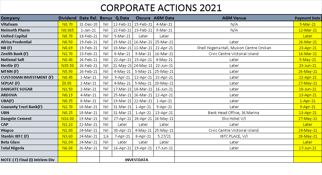 Equities Corporate Actions On NGSE As Of Friday, March 26, 2021 Editor March 26, 2021 1 min read 210 Post Views: 559 Continue Reading Previous: Investdata Price, Earnings Tracking For Week Ended March 26, 2021Next: Mixed Outlook, Profit Booking, Ahead Of More Earnings, Dividend Trending Now Bank Liquidation: NDIC, EFCC Agree Stronger Partnership For Asset Recovery, Prosecution Of Offenders 1 Bank Liquidation: NDIC, EFCC Agree Stronger Partnership For Asset Recovery, Prosecution Of Offenders January 26, 2026 Oil Prices Climb On Sanctions, Supply Risks 2 Oil Prices Climb On Sanctions, Supply Risks January 26, 2026 GDP: Nigeria Operating Far Below Its Productive Capacity 3 GDP: Nigeria Operating Far Below Its Productive Capacity January 25, 2026 Nigerian Bourse Ranges On Profit Taking Ahead Earnings Expectations, Sector Rotation 4 Nigerian Bourse Ranges On Profit Taking Ahead Earnings Expectations, Sector Rotation January 24, 2026 Corporate Actions On NGX As Of Friday, January 23, 2026 5 Corporate Actions On NGX As Of Friday, January 23, 2026 January 24, 2026 NGX Ends Week On Cautious Positive Note As Selective Buying Offsets Profit-Taking Pressures 6 NGX Ends Week On Cautious Positive Note As Selective Buying Offsets Profit-Taking Pressures January 24, 2026 Related Stories Corporate Actions On NGX As Of Friday, January 23, 2026 1 min read Equities Corporate Actions On NGX As Of Friday, January 23, 2026 January 24, 2026 83 NGX Ends Week On Cautious Positive Note As Selective Buying Offsets Profit-Taking Pressures 3 min read Equities NGX Ends Week On Cautious Positive Note As Selective Buying Offsets Profit-Taking Pressures January 24, 2026 96 NGX Ends Bearish On Heavyweight Selloffs Amid Cautious Sentiment 2 min read Equities NGX Ends Bearish On Heavyweight Selloffs Amid Cautious Sentiment January 23, 2026 176 Cautious Bargain Hunting Lifts Equities Marginally Amid Mixed Sector Performance 3 min read Equities Cautious Bargain Hunting Lifts Equities Marginally Amid Mixed Sector Performance January 22, 2026 173 Nigerian Equities Post Modest Rebound As Bargain Hunting, Oil Strength Support Market 3 min read Equities Nigerian Equities Post Modest Rebound As Bargain Hunting, Oil Strength Support Market January 21, 2026 191 Nigerian Equities End Flat-To-Bearish As Profit Taking Offsets Broad Buying, Composite Index Holds Key Support 3 min read Equities Nigerian Equities End Flat-To-Bearish As Profit Taking Offsets Broad Buying, Composite Index Holds Key Support January 20, 2026 195