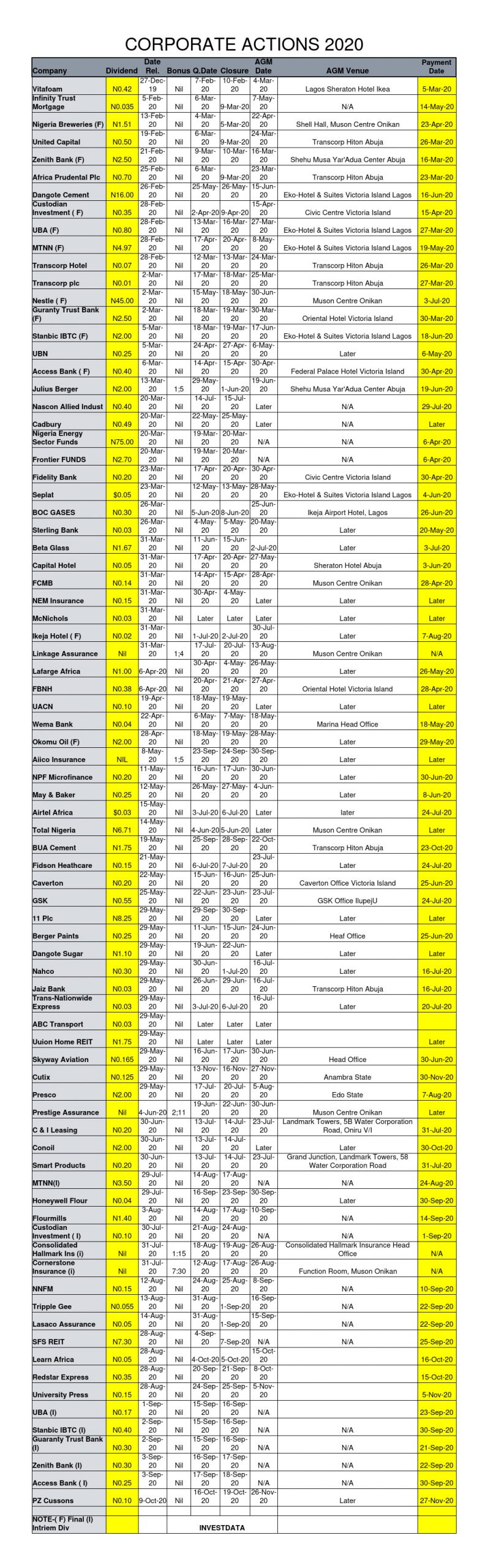 Equities Corporate Actions On NGSE As Of Friday, October 23, 2020 Editor October 24, 2020 1 min read 184 Post Views: 405 Continue Reading Previous: Investdata Price, Earnings Tracking For Week Ended October 23, 2020Next: Investors Seek Safe Bets, As Q3 Earnings Influence Equity Prices Ahead Of Deadline Trending Now NGX Closes Week Strong As Blue Chips Drive Composite Index Higher 1 NGX Closes Week Strong As Blue Chips Drive Composite Index Higher February 13, 2026 Oil Prices Fall On Weaker Demand, Rising Supply 2 Oil Prices Fall On Weaker Demand, Rising Supply February 13, 2026 Nigeria’s Equity Market Maintains Bullish Bias As Selective Buying Drives Gains 3 Nigeria’s Equity Market Maintains Bullish Bias As Selective Buying Drives Gains February 13, 2026 Oil Gains As U.S.–Iran Tensions Offset Inventory Surge 4 Oil Gains As U.S.–Iran Tensions Offset Inventory Surge February 12, 2026 Bullish Momentum Persists As NGX Extends Winning Streak 5 Bullish Momentum Persists As NGX Extends Winning Streak February 12, 2026 Delayed: Nigerian Bourse Rally Persists as Benchmark Index Gains 1.65% 6 Delayed: Nigerian Bourse Rally Persists as Benchmark Index Gains 1.65% February 11, 2026 Related Stories NGX Closes Week Strong As Blue Chips Drive Composite Index Higher 3 min read Equities NGX Closes Week Strong As Blue Chips Drive Composite Index Higher February 13, 2026 136 Nigeria’s Equity Market Maintains Bullish Bias As Selective Buying Drives Gains 3 min read Equities Nigeria’s Equity Market Maintains Bullish Bias As Selective Buying Drives Gains February 13, 2026 99 Oil Gains As U.S.–Iran Tensions Offset Inventory Surge 2 min read Equities Oil Gains As U.S.–Iran Tensions Offset Inventory Surge February 12, 2026 96 Bullish Momentum Persists As NGX Extends Winning Streak 3 min read Equities Bullish Momentum Persists As NGX Extends Winning Streak February 12, 2026 119 Delayed: Nigerian Bourse Rally Persists as Benchmark Index Gains 1.65% 4 min read Equities Delayed: Nigerian Bourse Rally Persists as Benchmark Index Gains 1.65% February 11, 2026 151 Corporate Actions On Nigerian Bourse As Of February 6, 2026 1 min read Equities Corporate Actions On Nigerian Bourse As Of February 6, 2026 February 9, 2026 157