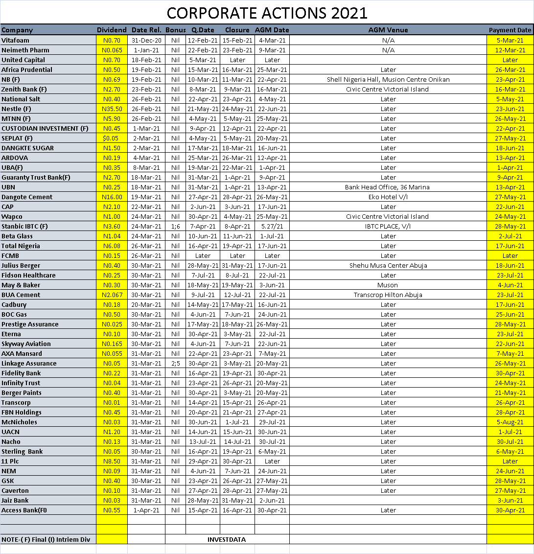 Equities Corporate Actions On NGSE As Of Thursday, April 1, 2021 Editor April 5, 2021 1 min read 206 Post Views: 569 Continue Reading Previous: Investdata Price & Earnings Tracking For Week Ended April 1, 2021Next: 2021Q1: NGSE Sheds 3.04%, Offers Short-term Prospects In Sound, Dividend Stocks Trending Now FCMB Group Plc: Still Undervalued Despite Growing Profit , Greater Efficiency, Resilience 1 FCMB Group Plc: Still Undervalued Despite Growing Profit , Greater Efficiency, Resilience December 12, 2025 Oil Prices Slip As Market Watches Russia-Ukraine Peace Talks 2 Oil Prices Slip As Market Watches Russia-Ukraine Peace Talks December 12, 2025 Nigerian Bourse Rebounds Strongly, Index Gains 0.74% Amid Broad-Based Buying, Market Outlook Turns Firmer 3 Nigerian Bourse Rebounds Strongly, Index Gains 0.74% Amid Broad-Based Buying, Market Outlook Turns Firmer December 11, 2025 Oil Prices Steady Ahead Of U.S. Rate Decision, Ukraine Peace Talks 4 Oil Prices Steady Ahead Of U.S. Rate Decision, Ukraine Peace Talks December 11, 2025 NGX Index Slips Again As Broad Profit-Taking Persists, Investors Brace For Year-End Rebalancing 5 NGX Index Slips Again As Broad Profit-Taking Persists, Investors Brace For Year-End Rebalancing December 10, 2025 Fidelity Bank Plc: With Improved Efficiency, Capital Boost Injection, Attractive For Long-Term 6 Fidelity Bank Plc: With Improved Efficiency, Capital Boost Injection, Attractive For Long-Term December 10, 2025 Related Stories Nigerian Bourse Rebounds Strongly, Index Gains 0.74% Amid Broad-Based Buying, Market Outlook Turns Firmer 3 min read Equities Nigerian Bourse Rebounds Strongly, Index Gains 0.74% Amid Broad-Based Buying, Market Outlook Turns Firmer December 11, 2025 7 NGX Index Slips Again As Broad Profit-Taking Persists, Investors Brace For Year-End Rebalancing 3 min read Equities NGX Index Slips Again As Broad Profit-Taking Persists, Investors Brace For Year-End Rebalancing December 10, 2025 3 Nigeria’s NGX Slips As Profit Taking Halts Rally Amid Cautious Investor Sentiments 3 min read Equities Nigeria’s NGX Slips As Profit Taking Halts Rally Amid Cautious Investor Sentiments December 9, 2025 3 Nigeria’s NGX Opens Week Strong As Bulls Tighten Grip, Banking Stocks Lead Momentum 4 min read Equities Nigeria’s NGX Opens Week Strong As Bulls Tighten Grip, Banking Stocks Lead Momentum December 9, 2025 1 Corporate Actions On Nigeran Exchange As Of Friday, December 5, 2025 1 min read Equities Corporate Actions On Nigeran Exchange As Of Friday, December 5, 2025 December 6, 2025 0 Nigeria’s Equity Market Sustains Uptrend, Closes Week Strong, As Bulls Tighten Grip Amid Renewed Interests in Banking, Industrials, Others 5 min read Equities Nigeria’s Equity Market Sustains Uptrend, Closes Week Strong, As Bulls Tighten Grip Amid Renewed Interests in Banking, Industrials, Others December 5, 2025 0