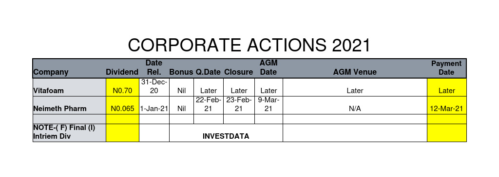 Uncategorized Corporate Actions On NGSE As Of Thursday, December 31, 2020 Editor January 2, 2021 1 min read 153 Post Views: 362 Continue Reading Previous: Investdata Price, Earnings Tracking For Week Ended December 31, 2020Next: Vitafoam Nigeria Net Profit Up 119%, Offers N0.70 Full-Year Dividend Trending Now SEC Nigeria Gives Capital Market Operators January 31 Deadline To Renew Registration 1 SEC Nigeria Gives Capital Market Operators January 31 Deadline To Renew Registration December 21, 2025 Investdata To Offer Tactical Trading Strategy For Higher Returns On NGX At 2026Q1 Master Class 2 Investdata To Offer Tactical Trading Strategy For Higher Returns On NGX At 2026Q1 Master Class December 20, 2025 Corporate Actions On NGX As Of Friday, December 19, 2025 3 Corporate Actions On NGX As Of Friday, December 19, 2025 December 20, 2025 Strong Buying Momentum Lifts NGX Index Above 152,000 Psychological Line On Heavy Volume 4 Strong Buying Momentum Lifts NGX Index Above 152,000 Psychological Line On Heavy Volume December 20, 2025 NGX Stretches Winning Streak To Seven Sessions As Broad Buying Keeps Bulls In Control 5 NGX Stretches Winning Streak To Seven Sessions As Broad Buying Keeps Bulls In Control December 19, 2025 Otedola Raises First HoldCo Plc Stake To 17.04% In Latest Deals 6 Otedola Raises First HoldCo Plc Stake To 17.04% In Latest Deals December 19, 2025 Related Stories AFCRaises US$524m In Dual-Currency 3-Year Facility From Japanese Capital Market 2 min read Uncategorized AFCRaises US$524m In Dual-Currency 3-Year Facility From Japanese Capital Market December 3, 2025 10 UK Budget May Trigger Exodus Of Assets From Britain- deVere CEO 3 min read Uncategorized UK Budget May Trigger Exodus Of Assets From Britain- deVere CEO November 20, 2025 14 Nigerian Equities Extend Rally Amid Liquidity, Sector Rotation, Sustained Bullish Momentum 3 min read Uncategorized Nigerian Equities Extend Rally Amid Liquidity, Sector Rotation, Sustained Bullish Momentum November 14, 2025 22 Nigeria’s Non-Interest Capital Market Worth ₦1.6tr, Says SEC DG 3 min read Uncategorized Nigeria’s Non-Interest Capital Market Worth ₦1.6tr, Says SEC DG November 5, 2025 38 UK Finance Minister’s Emergency Speech Indication Tax Raises Imminent, Says deVere CEO 3 min read Uncategorized UK Finance Minister’s Emergency Speech Indication Tax Raises Imminent, Says deVere CEO November 4, 2025 10 UBA Plc Nets N537.72bn Q3 Profit, As Interest Income Up 10%, Loan Loss Charge Slip 53.93% 4 min read Uncategorized UBA Plc Nets N537.72bn Q3 Profit, As Interest Income Up 10%, Loan Loss Charge Slip 53.93% October 31, 2025 21