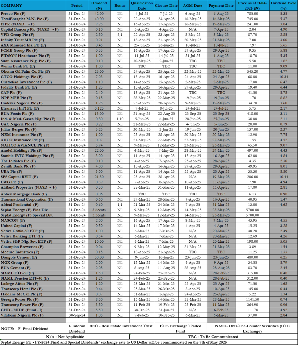 Equities Corporate Actions On NGX As Of Friday, April 11, 2025 Editor April 12, 2025 1 min read 135 Post Views: 91 Continue Reading Previous: Mixed Sentiment, Rebound May Continue As Investors Digest Emerging Global Outlook, Bet On Q1 EarningsNext: Mixed Sentiment On NGX Ahead Of March Inflation Data, More Earnings Inflow Trending Now SEC Nigeria Gives Capital Market Operators January 31 Deadline To Renew Registration 1 SEC Nigeria Gives Capital Market Operators January 31 Deadline To Renew Registration December 21, 2025 Investdata To Offer Tactical Trading Strategy For Higher Returns On NGX At 2026Q1 Master Class 2 Investdata To Offer Tactical Trading Strategy For Higher Returns On NGX At 2026Q1 Master Class December 20, 2025 Corporate Actions On NGX As Of Friday, December 19, 2025 3 Corporate Actions On NGX As Of Friday, December 19, 2025 December 20, 2025 Strong Buying Momentum Lifts NGX Index Above 152,000 Psychological Line On Heavy Volume 4 Strong Buying Momentum Lifts NGX Index Above 152,000 Psychological Line On Heavy Volume December 20, 2025 NGX Stretches Winning Streak To Seven Sessions As Broad Buying Keeps Bulls In Control 5 NGX Stretches Winning Streak To Seven Sessions As Broad Buying Keeps Bulls In Control December 19, 2025 Otedola Raises First HoldCo Plc Stake To 17.04% In Latest Deals 6 Otedola Raises First HoldCo Plc Stake To 17.04% In Latest Deals December 19, 2025 Related Stories Corporate Actions On NGX As Of Friday, December 19, 2025 1 min read Equities Corporate Actions On NGX As Of Friday, December 19, 2025 December 20, 2025 55 NGX Stretches Winning Streak To Seven Sessions As Broad Buying Keeps Bulls In Control 3 min read Equities NGX Stretches Winning Streak To Seven Sessions As Broad Buying Keeps Bulls In Control December 19, 2025 146 NGX Maintains Uptrend As Investors Accumulate Blue Chips Despite Slower Trading Activity 3 min read Equities NGX Maintains Uptrend As Investors Accumulate Blue Chips Despite Slower Trading Activity December 18, 2025 150 Cautious Buying Persists As Select Stocks Drive Marginal Market Upside 4 min read Equities Cautious Buying Persists As Select Stocks Drive Marginal Market Upside December 16, 2025 115 NGX Edges Higher Amid Selective Buying, Market Consolidates Near Recent Highs 3 min read Equities NGX Edges Higher Amid Selective Buying, Market Consolidates Near Recent Highs December 15, 2025 168 Corporate Actions On NGX As Of Friday, December 11, 2025 1 min read Equities Corporate Actions On NGX As Of Friday, December 11, 2025 December 13, 2025 195