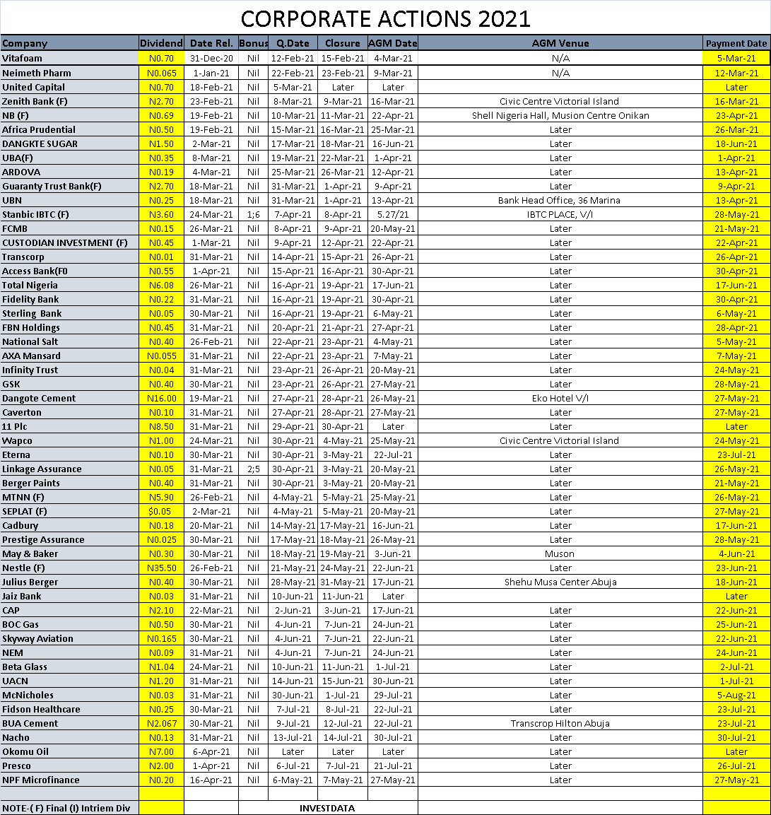 Equities Corporate Actions On NGX As Of Friday, April 23, 2021 Editor April 24, 2021 1 min read 241 Post Views: 369 Continue Reading Previous: Investdata Price, Earnings Tracking For Week Ended April 23, 2021Next: Mixed Trend Still, As Investors Position On Q1 Earnings Releases, Fixed Income Yields Trending Now Bank Liquidation: NDIC, EFCC Agree Stronger Partnership For Asset Recovery, Prosecution Of Offenders 1 Bank Liquidation: NDIC, EFCC Agree Stronger Partnership For Asset Recovery, Prosecution Of Offenders January 26, 2026 Oil Prices Climb On Sanctions, Supply Risks 2 Oil Prices Climb On Sanctions, Supply Risks January 26, 2026 GDP: Nigeria Operating Far Below Its Productive Capacity 3 GDP: Nigeria Operating Far Below Its Productive Capacity January 25, 2026 Nigerian Bourse Ranges On Profit Taking Ahead Earnings Expectations, Sector Rotation 4 Nigerian Bourse Ranges On Profit Taking Ahead Earnings Expectations, Sector Rotation January 24, 2026 Corporate Actions On NGX As Of Friday, January 23, 2026 5 Corporate Actions On NGX As Of Friday, January 23, 2026 January 24, 2026 NGX Ends Week On Cautious Positive Note As Selective Buying Offsets Profit-Taking Pressures 6 NGX Ends Week On Cautious Positive Note As Selective Buying Offsets Profit-Taking Pressures January 24, 2026 Related Stories Corporate Actions On NGX As Of Friday, January 23, 2026 1 min read Equities Corporate Actions On NGX As Of Friday, January 23, 2026 January 24, 2026 93 NGX Ends Week On Cautious Positive Note As Selective Buying Offsets Profit-Taking Pressures 3 min read Equities NGX Ends Week On Cautious Positive Note As Selective Buying Offsets Profit-Taking Pressures January 24, 2026 103 NGX Ends Bearish On Heavyweight Selloffs Amid Cautious Sentiment 2 min read Equities NGX Ends Bearish On Heavyweight Selloffs Amid Cautious Sentiment January 23, 2026 183 Cautious Bargain Hunting Lifts Equities Marginally Amid Mixed Sector Performance 3 min read Equities Cautious Bargain Hunting Lifts Equities Marginally Amid Mixed Sector Performance January 22, 2026 173 Nigerian Equities Post Modest Rebound As Bargain Hunting, Oil Strength Support Market 3 min read Equities Nigerian Equities Post Modest Rebound As Bargain Hunting, Oil Strength Support Market January 21, 2026 191 Nigerian Equities End Flat-To-Bearish As Profit Taking Offsets Broad Buying, Composite Index Holds Key Support 3 min read Equities Nigerian Equities End Flat-To-Bearish As Profit Taking Offsets Broad Buying, Composite Index Holds Key Support January 20, 2026 195