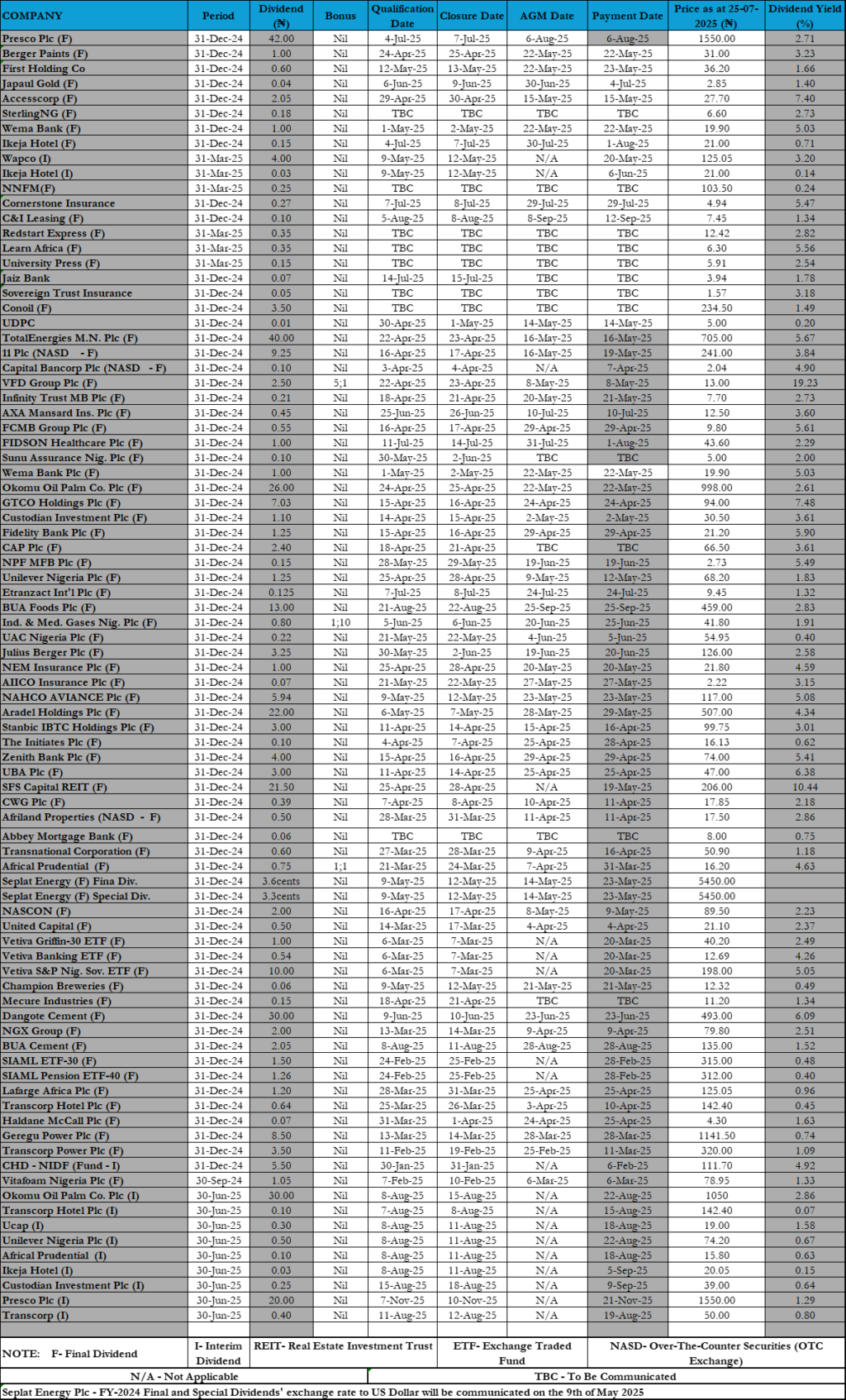 Equities Corporate Actions On NGX As Of Friday, August 1, 2025 Editor August 2, 2025 1 min read 100 Post Views: 40 Continue Reading Previous: NGX Rallies 16.57% in July, Closes Month At Record High, As All-Share Index Hits 139,863.52bpsNext: Nigerian Equities Start August On Strong Footing, As Investors Push More Stocks To 52-Week Highs Trending Now 2025 Insurance Reform: Step In Right Direction But Outflows Still In Billions 1 2025 Insurance Reform: Step In Right Direction But Outflows Still In Billions March 3, 2026 Oil, Gas Prices Spike As Middle East Conflict Disrupts Hormuz Shipping Activities 2 Oil, Gas Prices Spike As Middle East Conflict Disrupts Hormuz Shipping Activities March 3, 2026 Nigerian Stock Market Rebounds Strongly As Selective Buying Lifts ASI 1.39% 3 Nigerian Stock Market Rebounds Strongly As Selective Buying Lifts ASI 1.39% March 3, 2026 Dangote Eyes Steel, Power, Ports For Africa’s Industrial Devt 4 Dangote Eyes Steel, Power, Ports For Africa’s Industrial Devt March 2, 2026 February Surge: NGX Composite Index Rallies 16.6% Despite Last Minute Profit-Booking, Impressive Corporate Actions 5 February Surge: NGX Composite Index Rallies 16.6% Despite Last Minute Profit-Booking, Impressive Corporate Actions February 28, 2026 Corporate Actions On Nigerian Bourse As Of Friday, February 27, 2026 6 Corporate Actions On Nigerian Bourse As Of Friday, February 27, 2026 February 28, 2026 Related Stories Nigerian Stock Market Rebounds Strongly As Selective Buying Lifts ASI 1.39% 3 min read Equities Nigerian Stock Market Rebounds Strongly As Selective Buying Lifts ASI 1.39% March 3, 2026 119 Corporate Actions On Nigerian Bourse As Of Friday, February 27, 2026 1 min read Equities Corporate Actions On Nigerian Bourse As Of Friday, February 27, 2026 February 28, 2026 139 Equities Wraps Up Week in the Red As Investors Lose N476bn In Market Value 3 min read Equities Equities Wraps Up Week in the Red As Investors Lose N476bn In Market Value February 28, 2026 120 Sustained Profit-Taking Drags NGX Lower As Investors Lose N515bn, Cautious Sentiment Persists 3 min read Equities Sustained Profit-Taking Drags NGX Lower As Investors Lose N515bn, Cautious Sentiment Persists February 27, 2026 234 Equities Dip At Midweek As Market Capitalization Drops N73bn, Index Eases 0.06% 3 min read Equities Equities Dip At Midweek As Market Capitalization Drops N73bn, Index Eases 0.06% February 26, 2026 172 Selling Pressure Returns as NGXASI Declines 0.91% Amid Renewed Bearish Sentiment 4 min read Equities Selling Pressure Returns as NGXASI Declines 0.91% Amid Renewed Bearish Sentiment February 25, 2026 242