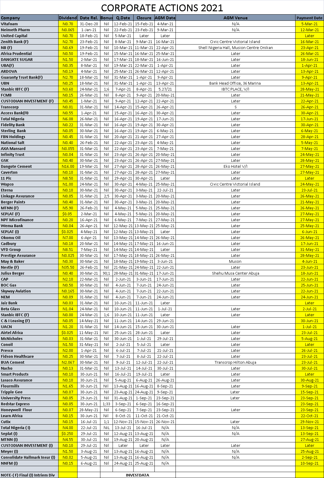 Equities Corporate Actions On NGX As Of Friday, August 13, 2021 August 14, 2021 1 min read 152 Post Views: 409 Continue Reading Previous: Investdata Price, Earnings Tracking For Week Ended August 13, 2021Next: Fair Value/Target Prices Of Selected Food/Beverage Stocks On NGX Trending Now Oil Prices Fall On Weaker Demand, Rising Supply 1 Oil Prices Fall On Weaker Demand, Rising Supply February 13, 2026 Nigeria’s Equity Market Maintains Bullish Bias As Selective Buying Drives Gains 2 Nigeria’s Equity Market Maintains Bullish Bias As Selective Buying Drives Gains February 13, 2026 Oil Gains As U.S.–Iran Tensions Offset Inventory Surge 3 Oil Gains As U.S.–Iran Tensions Offset Inventory Surge February 12, 2026 Bullish Momentum Persists As NGX Extends Winning Streak 4 Bullish Momentum Persists As NGX Extends Winning Streak February 12, 2026 Delayed: Nigerian Bourse Rally Persists as Benchmark Index Gains 1.65% 5 Delayed: Nigerian Bourse Rally Persists as Benchmark Index Gains 1.65% February 11, 2026 Oil Holds Steady Ahead of U.S.-Iran Talks 6 Oil Holds Steady Ahead of U.S.-Iran Talks February 11, 2026 Related Stories Nigeria’s Equity Market Maintains Bullish Bias As Selective Buying Drives Gains 3 min read Equities Nigeria’s Equity Market Maintains Bullish Bias As Selective Buying Drives Gains February 13, 2026 67 Oil Gains As U.S.–Iran Tensions Offset Inventory Surge 2 min read Equities Oil Gains As U.S.–Iran Tensions Offset Inventory Surge February 12, 2026 74 Bullish Momentum Persists As NGX Extends Winning Streak 3 min read Equities Bullish Momentum Persists As NGX Extends Winning Streak February 12, 2026 93 Delayed: Nigerian Bourse Rally Persists as Benchmark Index Gains 1.65% 4 min read Equities Delayed: Nigerian Bourse Rally Persists as Benchmark Index Gains 1.65% February 11, 2026 127 Corporate Actions On Nigerian Bourse As Of February 6, 2026 1 min read Equities Corporate Actions On Nigerian Bourse As Of February 6, 2026 February 9, 2026 152 Delayed: NGX Halts Ranging Market On Positive Reactions To Corporate Earnings Ahead Dividend Announcement 6 min read Equities Delayed: NGX Halts Ranging Market On Positive Reactions To Corporate Earnings Ahead Dividend Announcement February 9, 2026 236