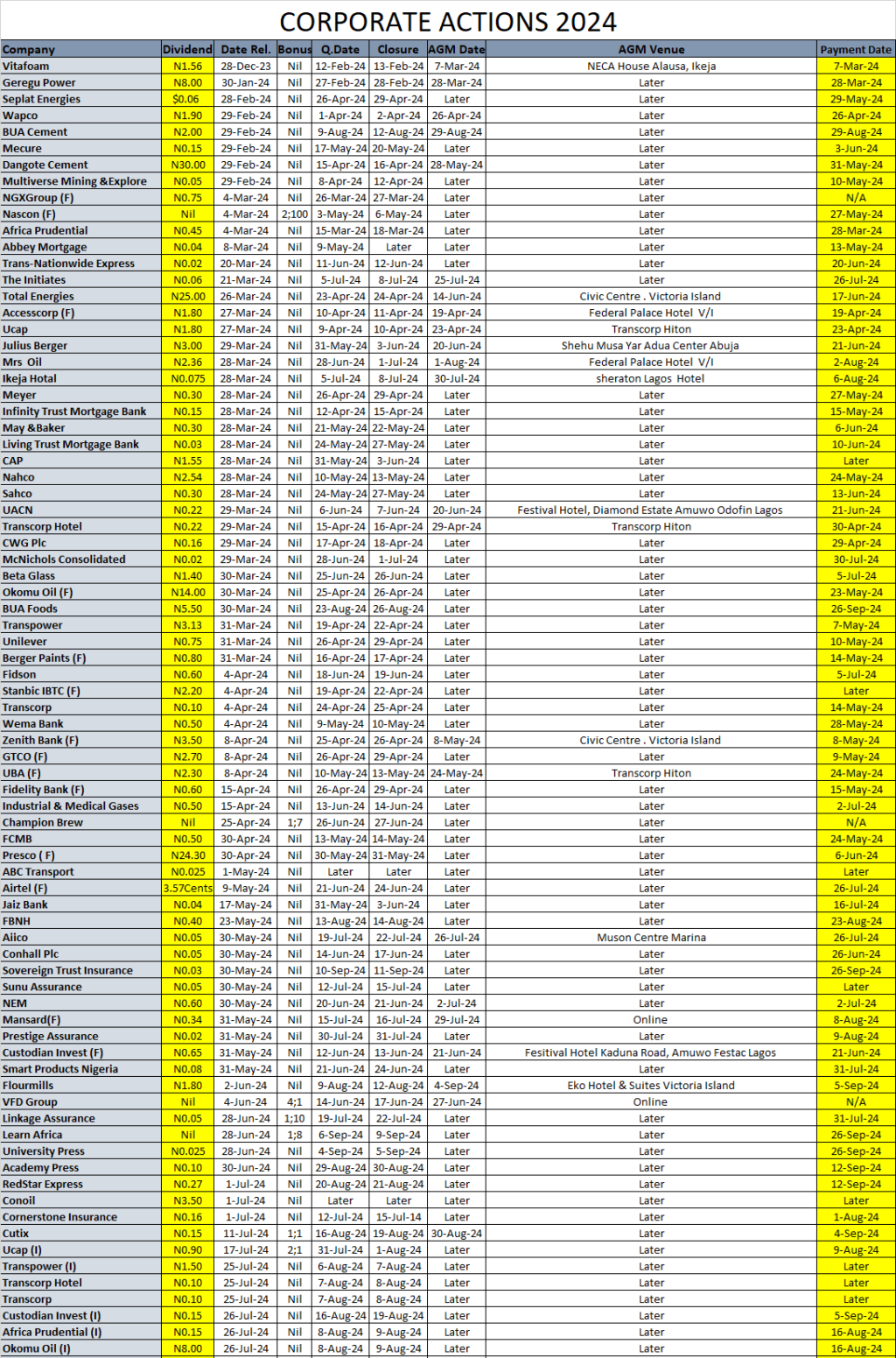 Equities Corporate Actions On NGX As Of Friday, August 23, 2024 Editor August 24, 2024 1 min read 283 Post Views: 160 Continue Reading Previous: Investdata Price, Earnings Tracking For The Week Ended August 23, 2024Next: Mixed Sentiment Ahead, As Investors Bet On Interim Dividend Paying Bank Earnings Trending Now NGX 2025 Year-End Review: Consumer Goods, Industrials Drive Historic 51% Surge, Set Stage For 2026 On Nigerian Bourse 1 NGX 2025 Year-End Review: Consumer Goods, Industrials Drive Historic 51% Surge, Set Stage For 2026 On Nigerian Bourse January 2, 2026 SEC Nigeria Mulls Green Energy Bonds, PPPs To Tackle National Power Sector Challenges 2 SEC Nigeria Mulls Green Energy Bonds, PPPs To Tackle National Power Sector Challenges January 1, 2026 NGX Closes 2025 Strong As Late Buying Lifts Banking Stocks, Market Breadth Improves 3 NGX Closes 2025 Strong As Late Buying Lifts Banking Stocks, Market Breadth Improves December 31, 2025 Presco Plc Says 103% Rights Issue Subscription Level Sign Of Strong Investor Confidence 4 Presco Plc Says 103% Rights Issue Subscription Level Sign Of Strong Investor Confidence December 31, 2025 Oil Prices Hold Steady On Tuesday Amid Global Tensions 5 Oil Prices Hold Steady On Tuesday Amid Global Tensions December 31, 2025 Nigerian Equities Sustain Rally As Liquidity, Sector Rotation Support Gains 6 Nigerian Equities Sustain Rally As Liquidity, Sector Rotation Support Gains December 30, 2025 Related Stories NGX 2025 Year-End Review: Consumer Goods, Industrials Drive Historic 51% Surge, Set Stage For 2026 On Nigerian Bourse 4 min read Equities NGX 2025 Year-End Review: Consumer Goods, Industrials Drive Historic 51% Surge, Set Stage For 2026 On Nigerian Bourse January 2, 2026 103 NGX Closes 2025 Strong As Late Buying Lifts Banking Stocks, Market Breadth Improves 5 min read Equities NGX Closes 2025 Strong As Late Buying Lifts Banking Stocks, Market Breadth Improves December 31, 2025 100 Nigerian Equities Sustain Rally As Liquidity, Sector Rotation Support Gains 5 min read Equities Nigerian Equities Sustain Rally As Liquidity, Sector Rotation Support Gains December 30, 2025 125 Nigerian Stocks Extend Santa Claus Rally As Composite Index Hits Fresh High 5 min read Equities Nigerian Stocks Extend Santa Claus Rally As Composite Index Hits Fresh High December 29, 2025 232 Corporate Actions On Nigerian Bourse As Of Wednesday, December 24, 2025 1 min read Equities Corporate Actions On Nigerian Bourse As Of Wednesday, December 24, 2025 December 27, 2025 181 NGX Ends Christmas Eve Higher As Banking, Consumer Stocks Advance 5 min read Equities NGX Ends Christmas Eve Higher As Banking, Consumer Stocks Advance December 24, 2025 289