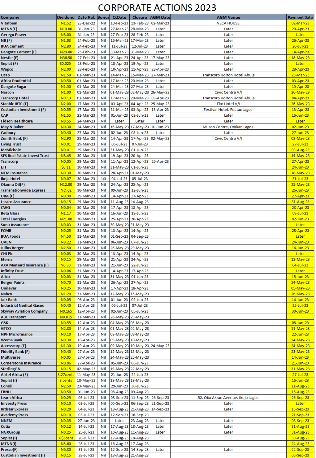 Equities Uncategorized Corporate Actions On NGX As Of Friday, August 25, 2023 Editor August 27, 2023 1 min read 300 Post Views: 150 Continue Reading Previous: Investdata Price, Earnings Tracking For Week Ended August 25, 2023Next: Mixed Sentiments On Bargain Hunting, As Investors Digest Q2 GDP, Await Tier-1 Banks Earnings Trending Now Nigerian Index Extends Two-Week Strong Buying Interests On Low Cap Stocks, Blue-Chip Gains 1 Nigerian Index Extends Two-Week Strong Buying Interests On Low Cap Stocks, Blue-Chip Gains December 13, 2025 Corporate Actions On NGX As Of Friday, December 11, 2025 2 Corporate Actions On NGX As Of Friday, December 11, 2025 December 13, 2025 FCMB Group Plc: Still Undervalued Despite Growing Profit , Greater Efficiency, Resilience 3 FCMB Group Plc: Still Undervalued Despite Growing Profit , Greater Efficiency, Resilience December 12, 2025 Oil Prices Slip As Market Watches Russia-Ukraine Peace Talks 4 Oil Prices Slip As Market Watches Russia-Ukraine Peace Talks December 12, 2025 Nigerian Bourse Rebounds Strongly, Index Gains 0.74% Amid Broad-Based Buying, Market Outlook Turns Firmer 5 Nigerian Bourse Rebounds Strongly, Index Gains 0.74% Amid Broad-Based Buying, Market Outlook Turns Firmer December 11, 2025 Oil Prices Steady Ahead Of U.S. Rate Decision, Ukraine Peace Talks 6 Oil Prices Steady Ahead Of U.S. Rate Decision, Ukraine Peace Talks December 11, 2025 Related Stories Corporate Actions On NGX As Of Friday, December 11, 2025 1 min read Equities Corporate Actions On NGX As Of Friday, December 11, 2025 December 13, 2025 73 Nigerian Bourse Rebounds Strongly, Index Gains 0.74% Amid Broad-Based Buying, Market Outlook Turns Firmer 3 min read Equities Nigerian Bourse Rebounds Strongly, Index Gains 0.74% Amid Broad-Based Buying, Market Outlook Turns Firmer December 11, 2025 96 NGX Index Slips Again As Broad Profit-Taking Persists, Investors Brace For Year-End Rebalancing 3 min read Equities NGX Index Slips Again As Broad Profit-Taking Persists, Investors Brace For Year-End Rebalancing December 10, 2025 55 Nigeria’s NGX Slips As Profit Taking Halts Rally Amid Cautious Investor Sentiments 3 min read Equities Nigeria’s NGX Slips As Profit Taking Halts Rally Amid Cautious Investor Sentiments December 9, 2025 33 Nigeria’s NGX Opens Week Strong As Bulls Tighten Grip, Banking Stocks Lead Momentum 4 min read Equities Nigeria’s NGX Opens Week Strong As Bulls Tighten Grip, Banking Stocks Lead Momentum December 9, 2025 12 Corporate Actions On Nigeran Exchange As Of Friday, December 5, 2025 1 min read Equities Corporate Actions On Nigeran Exchange As Of Friday, December 5, 2025 December 6, 2025 6