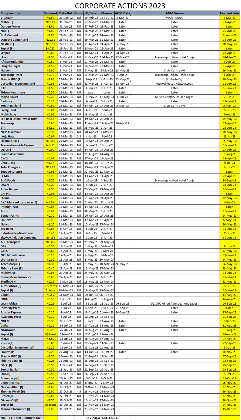 Equities Corporate Actions On NGX As Of Friday, December 2023 Editor December 23, 2023 1 min read 298 Post Views: 99 Continue Reading Previous: NGX Index Soars Higher, Amid Positive Sentiments, Bargain Hunting For Dividend Stocks, EarningsNext: Santa Claus Rally Continues On NGX Amidst Last Minutes Positioning, Profit Booking Trending Now NGX Consolidates As Bargain Hunting Counters Profit-Taking Amid Weak Volume 1 NGX Consolidates As Bargain Hunting Counters Profit-Taking Amid Weak Volume January 27, 2026 Oil Prices Steady But Supply Risks Persist 2 Oil Prices Steady But Supply Risks Persist January 27, 2026 Gold smashes $5,000, will it get to $6,000 this year? 3 Gold smashes $5,000, will it get to $6,000 this year? January 27, 2026 Bank Liquidation: NDIC, EFCC Agree Stronger Partnership For Asset Recovery, Prosecution Of Offenders 4 Bank Liquidation: NDIC, EFCC Agree Stronger Partnership For Asset Recovery, Prosecution Of Offenders January 26, 2026 Oil Prices Climb On Sanctions, Supply Risks 5 Oil Prices Climb On Sanctions, Supply Risks January 26, 2026 GDP: Nigeria Operating Far Below Its Productive Capacity 6 GDP: Nigeria Operating Far Below Its Productive Capacity January 25, 2026 Related Stories NGX Consolidates As Bargain Hunting Counters Profit-Taking Amid Weak Volume 3 min read Equities NGX Consolidates As Bargain Hunting Counters Profit-Taking Amid Weak Volume January 27, 2026 79 Corporate Actions On NGX As Of Friday, January 23, 2026 1 min read Equities Corporate Actions On NGX As Of Friday, January 23, 2026 January 24, 2026 130 NGX Ends Week On Cautious Positive Note As Selective Buying Offsets Profit-Taking Pressures 3 min read Equities NGX Ends Week On Cautious Positive Note As Selective Buying Offsets Profit-Taking Pressures January 24, 2026 131 NGX Ends Bearish On Heavyweight Selloffs Amid Cautious Sentiment 2 min read Equities NGX Ends Bearish On Heavyweight Selloffs Amid Cautious Sentiment January 23, 2026 199 Cautious Bargain Hunting Lifts Equities Marginally Amid Mixed Sector Performance 3 min read Equities Cautious Bargain Hunting Lifts Equities Marginally Amid Mixed Sector Performance January 22, 2026 175 Nigerian Equities Post Modest Rebound As Bargain Hunting, Oil Strength Support Market 3 min read Equities Nigerian Equities Post Modest Rebound As Bargain Hunting, Oil Strength Support Market January 21, 2026 194