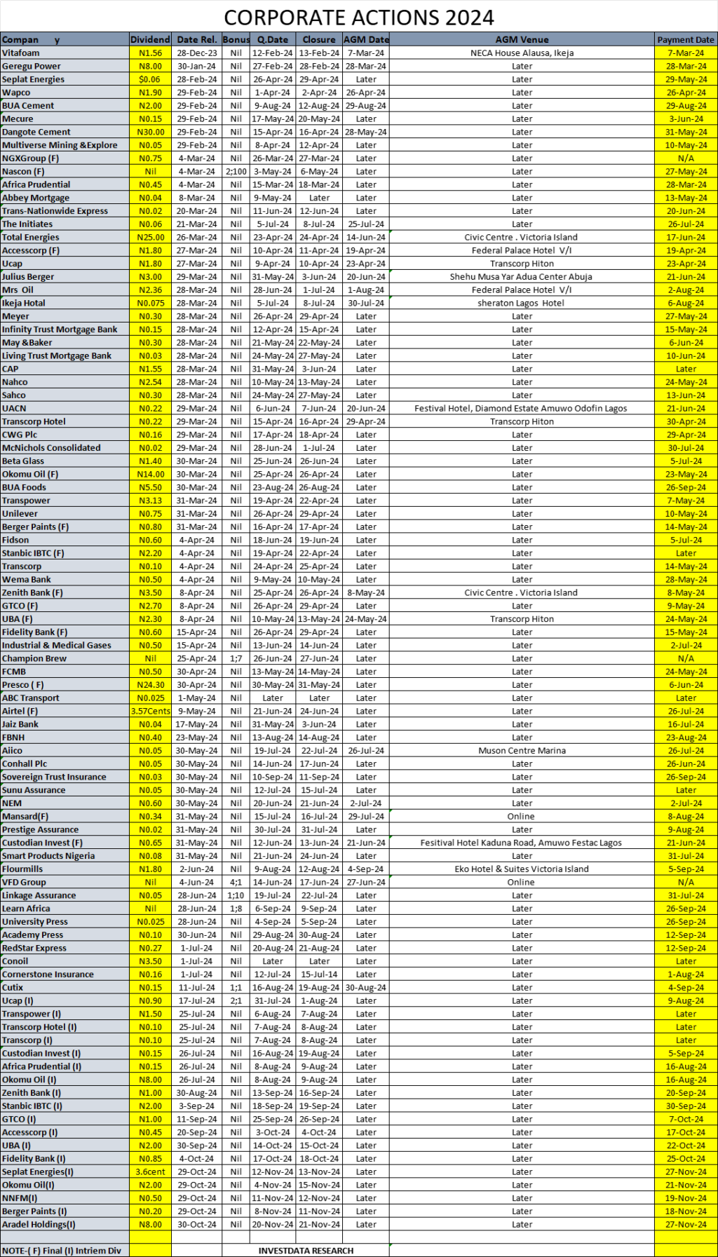 Uncategorized Corporate Actions On NGX As Of Friday, December 27, 2024 Editor December 30, 2024 1 min read 203 Post Views: 141 Continue Reading Previous: Gold Tests Resistance Rage Near $2,600/Ounce Amid Inflation Market ConcernsNext: LIRS Gives Employers Till Jan. 31 To File Annual Tax Returns Trending Now NGX Ends Christmas Eve Higher As Banking, Consumer Stocks Advance 1 NGX Ends Christmas Eve Higher As Banking, Consumer Stocks Advance December 24, 2025 NGX Sustains Bullish Momentum As Buying Pressure Keeps Market On The Upside 2 NGX Sustains Bullish Momentum As Buying Pressure Keeps Market On The Upside December 23, 2025 NGX Extends Rally As Sector Rotation Persists 3 NGX Extends Rally As Sector Rotation Persists December 23, 2025 Oil Prices Edge Higher On Venezuela, Ukraine Tensions 4 Oil Prices Edge Higher On Venezuela, Ukraine Tensions December 23, 2025 SEC Nigeria Gives Capital Market Operators January 31 Deadline To Renew Registration 5 SEC Nigeria Gives Capital Market Operators January 31 Deadline To Renew Registration December 21, 2025 Investdata To Offer Tactical Trading Strategy For Higher Returns On NGX At 2026Q1 Master Class 6 Investdata To Offer Tactical Trading Strategy For Higher Returns On NGX At 2026Q1 Master Class December 20, 2025 Related Stories AFCRaises US$524m In Dual-Currency 3-Year Facility From Japanese Capital Market 2 min read Uncategorized AFCRaises US$524m In Dual-Currency 3-Year Facility From Japanese Capital Market December 3, 2025 13 UK Budget May Trigger Exodus Of Assets From Britain- deVere CEO 3 min read Uncategorized UK Budget May Trigger Exodus Of Assets From Britain- deVere CEO November 20, 2025 15 Nigerian Equities Extend Rally Amid Liquidity, Sector Rotation, Sustained Bullish Momentum 3 min read Uncategorized Nigerian Equities Extend Rally Amid Liquidity, Sector Rotation, Sustained Bullish Momentum November 14, 2025 31 Nigeria’s Non-Interest Capital Market Worth ₦1.6tr, Says SEC DG 3 min read Uncategorized Nigeria’s Non-Interest Capital Market Worth ₦1.6tr, Says SEC DG November 5, 2025 46 UK Finance Minister’s Emergency Speech Indication Tax Raises Imminent, Says deVere CEO 3 min read Uncategorized UK Finance Minister’s Emergency Speech Indication Tax Raises Imminent, Says deVere CEO November 4, 2025 12 UBA Plc Nets N537.72bn Q3 Profit, As Interest Income Up 10%, Loan Loss Charge Slip 53.93% 4 min read Uncategorized UBA Plc Nets N537.72bn Q3 Profit, As Interest Income Up 10%, Loan Loss Charge Slip 53.93% October 31, 2025 25