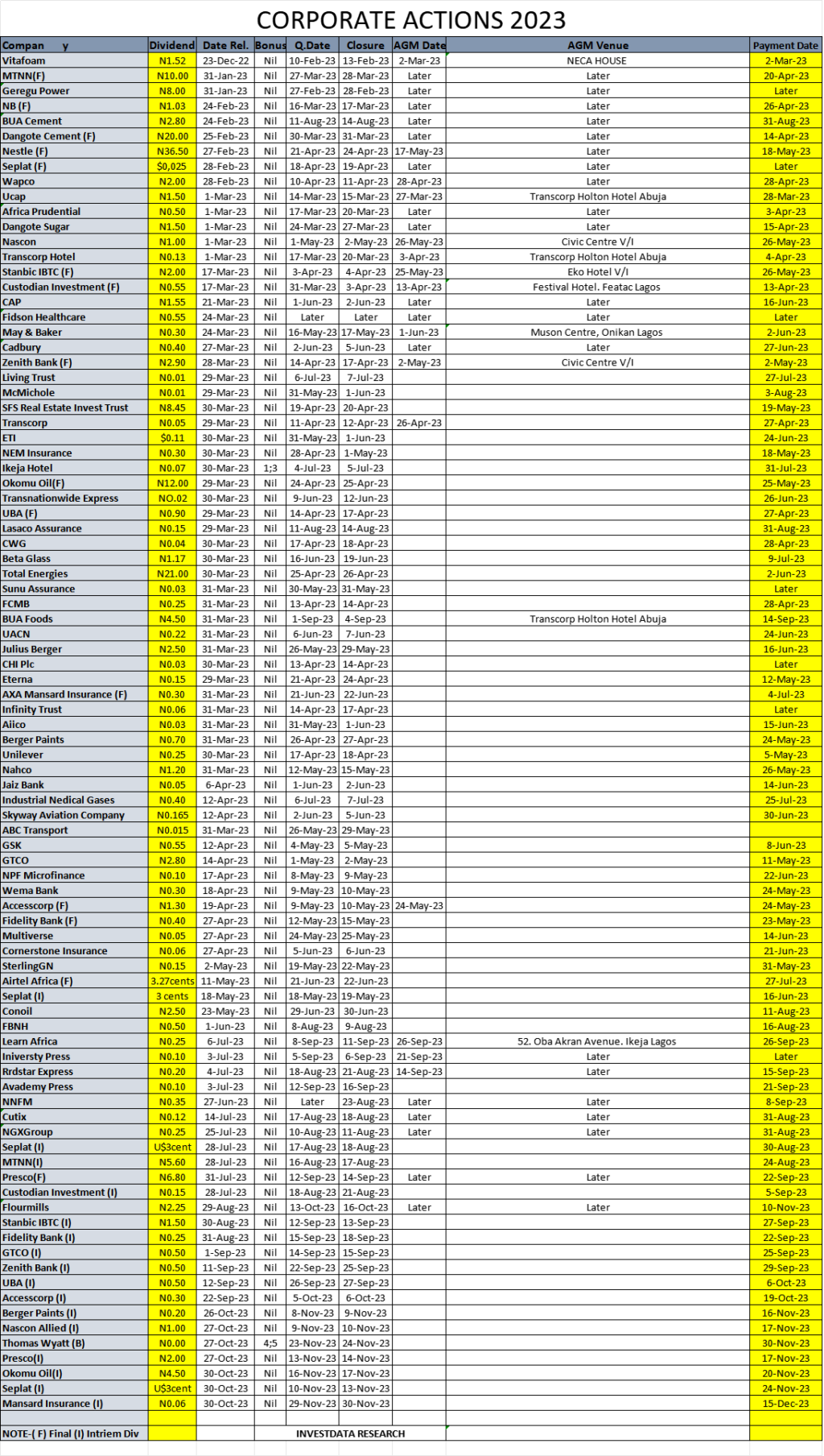 Equities Corporate Actions On NGX As Of Friday, December 8, 2023 Editor December 10, 2023 1 min read 551 Post Views: 85 Continue Reading Previous: Investdata Price, Earnings Tracking For Week Ended December 8, 2023Next: Bargain Hunting Likely, As Naira Devaluation Makes Nigerian Equities More Attractive Trending Now NGX Ends Christmas Eve Higher As Banking, Consumer Stocks Advance 1 NGX Ends Christmas Eve Higher As Banking, Consumer Stocks Advance December 24, 2025 NGX Sustains Bullish Momentum As Buying Pressure Keeps Market On The Upside 2 NGX Sustains Bullish Momentum As Buying Pressure Keeps Market On The Upside December 23, 2025 NGX Extends Rally As Sector Rotation Persists 3 NGX Extends Rally As Sector Rotation Persists December 23, 2025 Oil Prices Edge Higher On Venezuela, Ukraine Tensions 4 Oil Prices Edge Higher On Venezuela, Ukraine Tensions December 23, 2025 SEC Nigeria Gives Capital Market Operators January 31 Deadline To Renew Registration 5 SEC Nigeria Gives Capital Market Operators January 31 Deadline To Renew Registration December 21, 2025 Investdata To Offer Tactical Trading Strategy For Higher Returns On NGX At 2026Q1 Master Class 6 Investdata To Offer Tactical Trading Strategy For Higher Returns On NGX At 2026Q1 Master Class December 20, 2025 Related Stories NGX Ends Christmas Eve Higher As Banking, Consumer Stocks Advance 5 min read Equities NGX Ends Christmas Eve Higher As Banking, Consumer Stocks Advance December 24, 2025 99 NGX Sustains Bullish Momentum As Buying Pressure Keeps Market On The Upside 5 min read Equities NGX Sustains Bullish Momentum As Buying Pressure Keeps Market On The Upside December 23, 2025 117 NGX Extends Rally As Sector Rotation Persists 5 min read Equities NGX Extends Rally As Sector Rotation Persists December 23, 2025 121 Corporate Actions On NGX As Of Friday, December 19, 2025 1 min read Equities Corporate Actions On NGX As Of Friday, December 19, 2025 December 20, 2025 124 NGX Stretches Winning Streak To Seven Sessions As Broad Buying Keeps Bulls In Control 3 min read Equities NGX Stretches Winning Streak To Seven Sessions As Broad Buying Keeps Bulls In Control December 19, 2025 208 NGX Maintains Uptrend As Investors Accumulate Blue Chips Despite Slower Trading Activity 3 min read Equities NGX Maintains Uptrend As Investors Accumulate Blue Chips Despite Slower Trading Activity December 18, 2025 187