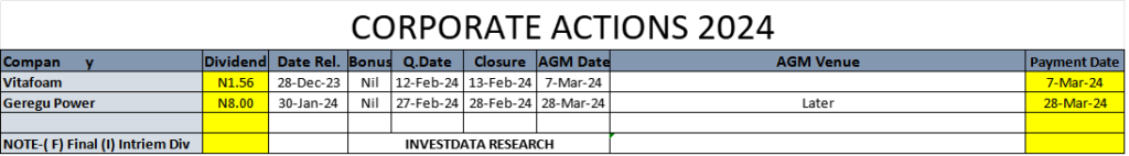 Equities Corporate Actions On NGX As Of Friday, February 16, 2024 Editor February 18, 2024 1 min read 682 Post Views: 119 Continue Reading Previous: Sentiments Stay Mixed As Investors Digest Latest Inflation Data, Bet On Strong Stocks Ahead Of MPC OutcomeNext: Investors Bet On Defensive, Div Stocks, MPC Outcome, As Naira’s Free Fall Makes Nigerian Stocks Cheaper Trending Now NGX Ends Christmas Eve Higher As Banking, Consumer Stocks Advance 1 NGX Ends Christmas Eve Higher As Banking, Consumer Stocks Advance December 24, 2025 NGX Sustains Bullish Momentum As Buying Pressure Keeps Market On The Upside 2 NGX Sustains Bullish Momentum As Buying Pressure Keeps Market On The Upside December 23, 2025 NGX Extends Rally As Sector Rotation Persists 3 NGX Extends Rally As Sector Rotation Persists December 23, 2025 Oil Prices Edge Higher On Venezuela, Ukraine Tensions 4 Oil Prices Edge Higher On Venezuela, Ukraine Tensions December 23, 2025 SEC Nigeria Gives Capital Market Operators January 31 Deadline To Renew Registration 5 SEC Nigeria Gives Capital Market Operators January 31 Deadline To Renew Registration December 21, 2025 Investdata To Offer Tactical Trading Strategy For Higher Returns On NGX At 2026Q1 Master Class 6 Investdata To Offer Tactical Trading Strategy For Higher Returns On NGX At 2026Q1 Master Class December 20, 2025 Related Stories NGX Ends Christmas Eve Higher As Banking, Consumer Stocks Advance 5 min read Equities NGX Ends Christmas Eve Higher As Banking, Consumer Stocks Advance December 24, 2025 135 NGX Sustains Bullish Momentum As Buying Pressure Keeps Market On The Upside 5 min read Equities NGX Sustains Bullish Momentum As Buying Pressure Keeps Market On The Upside December 23, 2025 148 NGX Extends Rally As Sector Rotation Persists 5 min read Equities NGX Extends Rally As Sector Rotation Persists December 23, 2025 144 Corporate Actions On NGX As Of Friday, December 19, 2025 1 min read Equities Corporate Actions On NGX As Of Friday, December 19, 2025 December 20, 2025 140 NGX Stretches Winning Streak To Seven Sessions As Broad Buying Keeps Bulls In Control 3 min read Equities NGX Stretches Winning Streak To Seven Sessions As Broad Buying Keeps Bulls In Control December 19, 2025 225 NGX Maintains Uptrend As Investors Accumulate Blue Chips Despite Slower Trading Activity 3 min read Equities NGX Maintains Uptrend As Investors Accumulate Blue Chips Despite Slower Trading Activity December 18, 2025 189