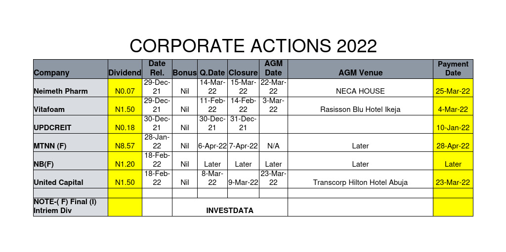 Equities Corporate Actions On NGX As Of Friday, February 18, 2022 February 19, 2022 1 min read 304 Post Views: 401 Continue Reading Previous: Investdata Price, Earnings Tracking For Week Ended February 18, 2022Next: Expect Bullish Sentiment, On More Audited Reports, Dividend News, Positive Momentum Trending Now GDP: Nigeria Operating Far Below Its Productive Capacity 1 GDP: Nigeria Operating Far Below Its Productive Capacity January 25, 2026 Nigerian Bourse Ranges On Profit Taking Ahead Earnings Expectations, Sector Rotation 2 Nigerian Bourse Ranges On Profit Taking Ahead Earnings Expectations, Sector Rotation January 24, 2026 Corporate Actions On NGX As Of Friday, January 23, 2026 3 Corporate Actions On NGX As Of Friday, January 23, 2026 January 24, 2026 NGX Ends Week On Cautious Positive Note As Selective Buying Offsets Profit-Taking Pressures 4 NGX Ends Week On Cautious Positive Note As Selective Buying Offsets Profit-Taking Pressures January 24, 2026 NGX Ends Bearish On Heavyweight Selloffs Amid Cautious Sentiment 5 NGX Ends Bearish On Heavyweight Selloffs Amid Cautious Sentiment January 23, 2026 Oil Slides as Geopolitical Tensions Ease, But Supply Concerns Linger 6 Oil Slides as Geopolitical Tensions Ease, But Supply Concerns Linger January 23, 2026 Related Stories Corporate Actions On NGX As Of Friday, January 23, 2026 1 min read Equities Corporate Actions On NGX As Of Friday, January 23, 2026 January 24, 2026 65 NGX Ends Week On Cautious Positive Note As Selective Buying Offsets Profit-Taking Pressures 3 min read Equities NGX Ends Week On Cautious Positive Note As Selective Buying Offsets Profit-Taking Pressures January 24, 2026 79 NGX Ends Bearish On Heavyweight Selloffs Amid Cautious Sentiment 2 min read Equities NGX Ends Bearish On Heavyweight Selloffs Amid Cautious Sentiment January 23, 2026 163 Cautious Bargain Hunting Lifts Equities Marginally Amid Mixed Sector Performance 3 min read Equities Cautious Bargain Hunting Lifts Equities Marginally Amid Mixed Sector Performance January 22, 2026 170 Nigerian Equities Post Modest Rebound As Bargain Hunting, Oil Strength Support Market 3 min read Equities Nigerian Equities Post Modest Rebound As Bargain Hunting, Oil Strength Support Market January 21, 2026 191 Nigerian Equities End Flat-To-Bearish As Profit Taking Offsets Broad Buying, Composite Index Holds Key Support 3 min read Equities Nigerian Equities End Flat-To-Bearish As Profit Taking Offsets Broad Buying, Composite Index Holds Key Support January 20, 2026 195