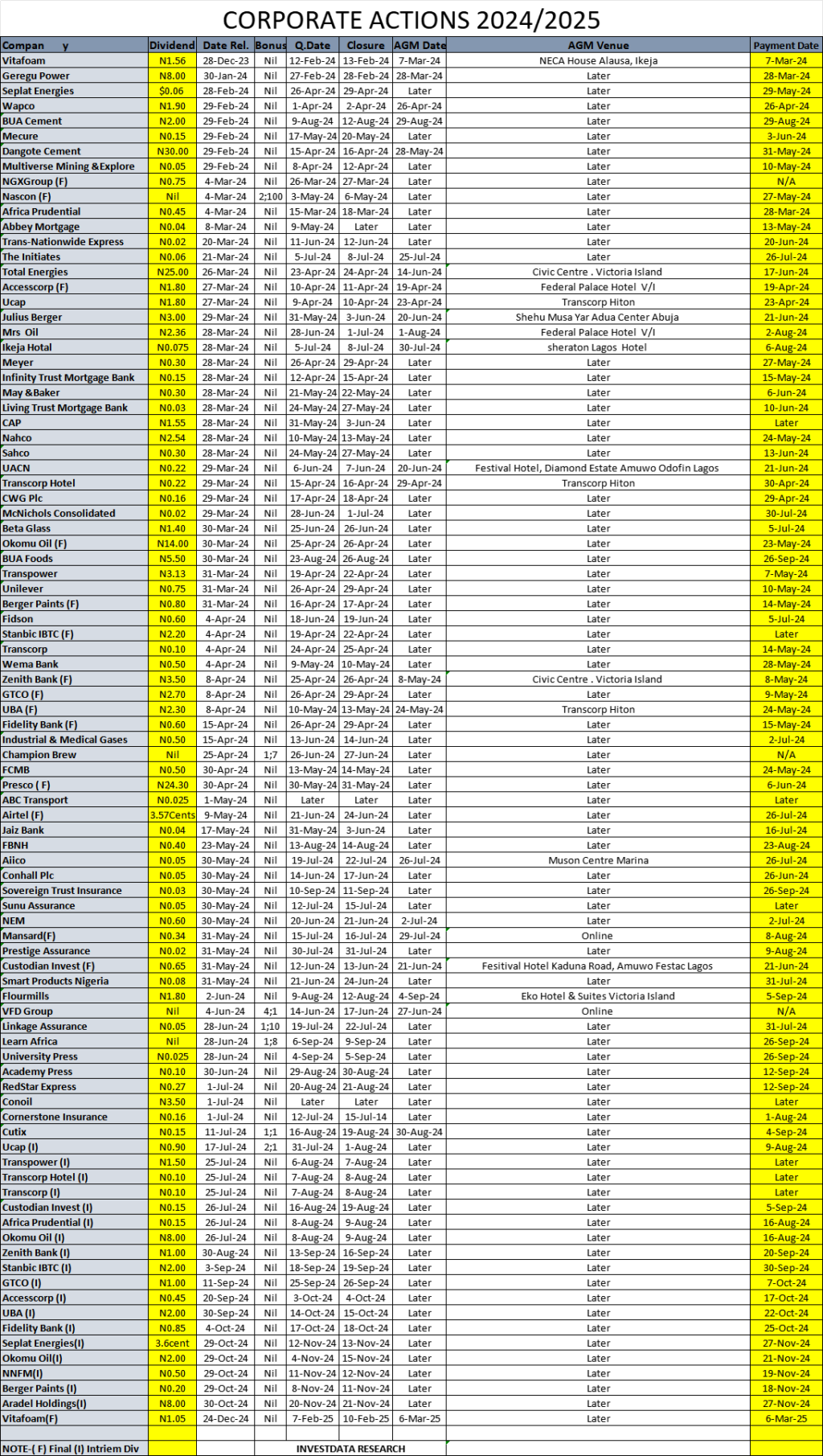 Equities Corporate Actions On NGX As Of Friday, January 10, 2025 Editor January 11, 2025 1 min read 205 Post Views: 124 Continue Reading Previous: Corporate Actions On NGX As Of Friday, January 3, 2025Next: Company Performances Support Dividend, Sentiments Drive Volatility Trending Now NGX Ends Christmas Eve Higher As Banking, Consumer Stocks Advance 1 NGX Ends Christmas Eve Higher As Banking, Consumer Stocks Advance December 24, 2025 NGX Sustains Bullish Momentum As Buying Pressure Keeps Market On The Upside 2 NGX Sustains Bullish Momentum As Buying Pressure Keeps Market On The Upside December 23, 2025 NGX Extends Rally As Sector Rotation Persists 3 NGX Extends Rally As Sector Rotation Persists December 23, 2025 Oil Prices Edge Higher On Venezuela, Ukraine Tensions 4 Oil Prices Edge Higher On Venezuela, Ukraine Tensions December 23, 2025 SEC Nigeria Gives Capital Market Operators January 31 Deadline To Renew Registration 5 SEC Nigeria Gives Capital Market Operators January 31 Deadline To Renew Registration December 21, 2025 Investdata To Offer Tactical Trading Strategy For Higher Returns On NGX At 2026Q1 Master Class 6 Investdata To Offer Tactical Trading Strategy For Higher Returns On NGX At 2026Q1 Master Class December 20, 2025 Related Stories NGX Ends Christmas Eve Higher As Banking, Consumer Stocks Advance 5 min read Equities NGX Ends Christmas Eve Higher As Banking, Consumer Stocks Advance December 24, 2025 64 NGX Sustains Bullish Momentum As Buying Pressure Keeps Market On The Upside 5 min read Equities NGX Sustains Bullish Momentum As Buying Pressure Keeps Market On The Upside December 23, 2025 92 NGX Extends Rally As Sector Rotation Persists 5 min read Equities NGX Extends Rally As Sector Rotation Persists December 23, 2025 101 Corporate Actions On NGX As Of Friday, December 19, 2025 1 min read Equities Corporate Actions On NGX As Of Friday, December 19, 2025 December 20, 2025 115 NGX Stretches Winning Streak To Seven Sessions As Broad Buying Keeps Bulls In Control 3 min read Equities NGX Stretches Winning Streak To Seven Sessions As Broad Buying Keeps Bulls In Control December 19, 2025 203 NGX Maintains Uptrend As Investors Accumulate Blue Chips Despite Slower Trading Activity 3 min read Equities NGX Maintains Uptrend As Investors Accumulate Blue Chips Despite Slower Trading Activity December 18, 2025 187