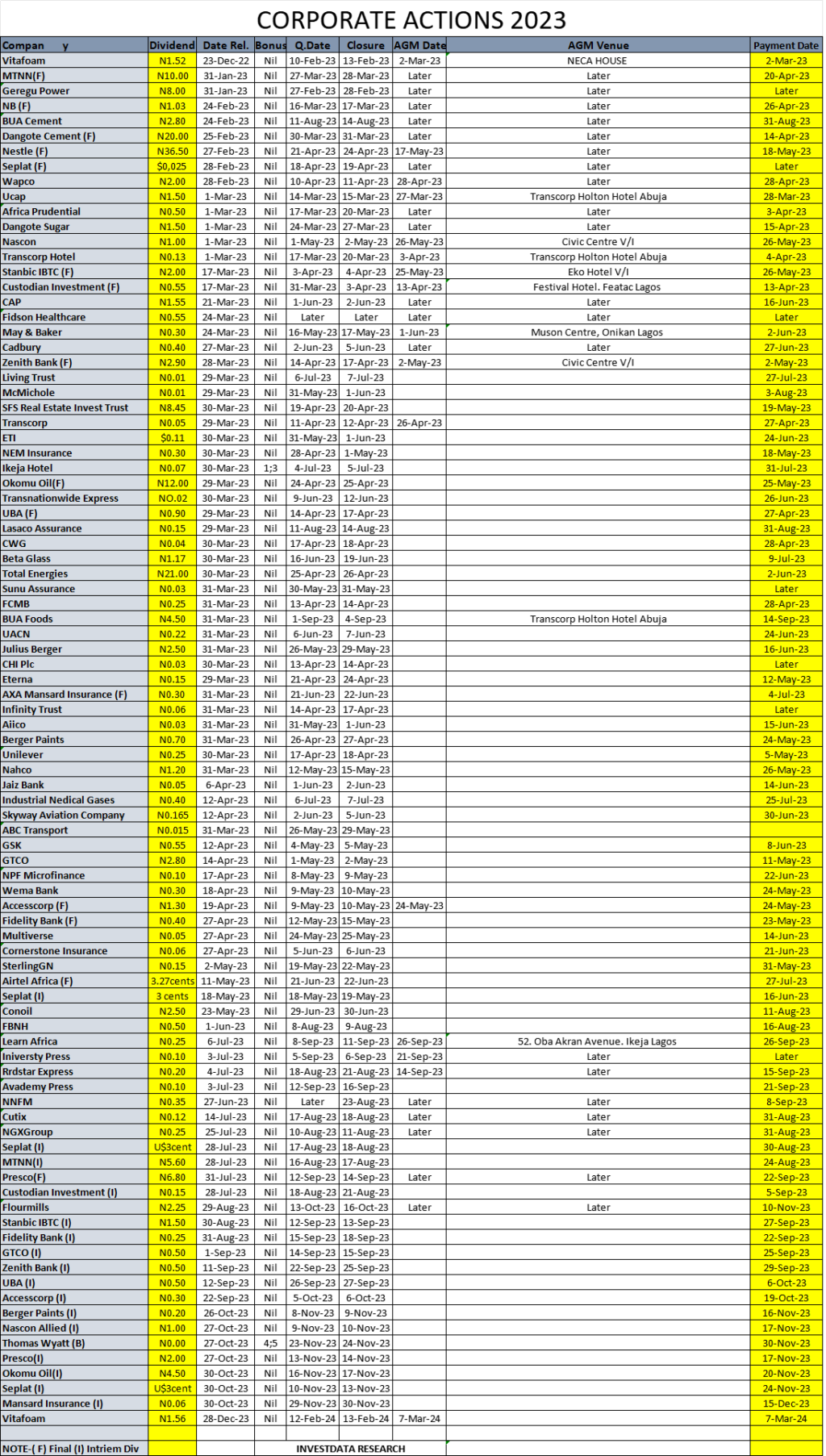 Equities Corporate Actions On NGX As Of Friday, January 12, 2024 Editor January 15, 2024 1 min read 848 Post Views: 118 Continue Reading Previous: Investdata Price, Earnings Tracking For Week Ended January 12, 2024Next: Profit Taking Yet, As Investors Eye Sound Stocks, Ahead Of Dec. Inflation, Earnings Season Trending Now NGX Ends Christmas Eve Higher As Banking, Consumer Stocks Advance 1 NGX Ends Christmas Eve Higher As Banking, Consumer Stocks Advance December 24, 2025 NGX Sustains Bullish Momentum As Buying Pressure Keeps Market On The Upside 2 NGX Sustains Bullish Momentum As Buying Pressure Keeps Market On The Upside December 23, 2025 NGX Extends Rally As Sector Rotation Persists 3 NGX Extends Rally As Sector Rotation Persists December 23, 2025 Oil Prices Edge Higher On Venezuela, Ukraine Tensions 4 Oil Prices Edge Higher On Venezuela, Ukraine Tensions December 23, 2025 SEC Nigeria Gives Capital Market Operators January 31 Deadline To Renew Registration 5 SEC Nigeria Gives Capital Market Operators January 31 Deadline To Renew Registration December 21, 2025 Investdata To Offer Tactical Trading Strategy For Higher Returns On NGX At 2026Q1 Master Class 6 Investdata To Offer Tactical Trading Strategy For Higher Returns On NGX At 2026Q1 Master Class December 20, 2025 Related Stories NGX Ends Christmas Eve Higher As Banking, Consumer Stocks Advance 5 min read Equities NGX Ends Christmas Eve Higher As Banking, Consumer Stocks Advance December 24, 2025 130 NGX Sustains Bullish Momentum As Buying Pressure Keeps Market On The Upside 5 min read Equities NGX Sustains Bullish Momentum As Buying Pressure Keeps Market On The Upside December 23, 2025 143 NGX Extends Rally As Sector Rotation Persists 5 min read Equities NGX Extends Rally As Sector Rotation Persists December 23, 2025 143 Corporate Actions On NGX As Of Friday, December 19, 2025 1 min read Equities Corporate Actions On NGX As Of Friday, December 19, 2025 December 20, 2025 139 NGX Stretches Winning Streak To Seven Sessions As Broad Buying Keeps Bulls In Control 3 min read Equities NGX Stretches Winning Streak To Seven Sessions As Broad Buying Keeps Bulls In Control December 19, 2025 210 NGX Maintains Uptrend As Investors Accumulate Blue Chips Despite Slower Trading Activity 3 min read Equities NGX Maintains Uptrend As Investors Accumulate Blue Chips Despite Slower Trading Activity December 18, 2025 188