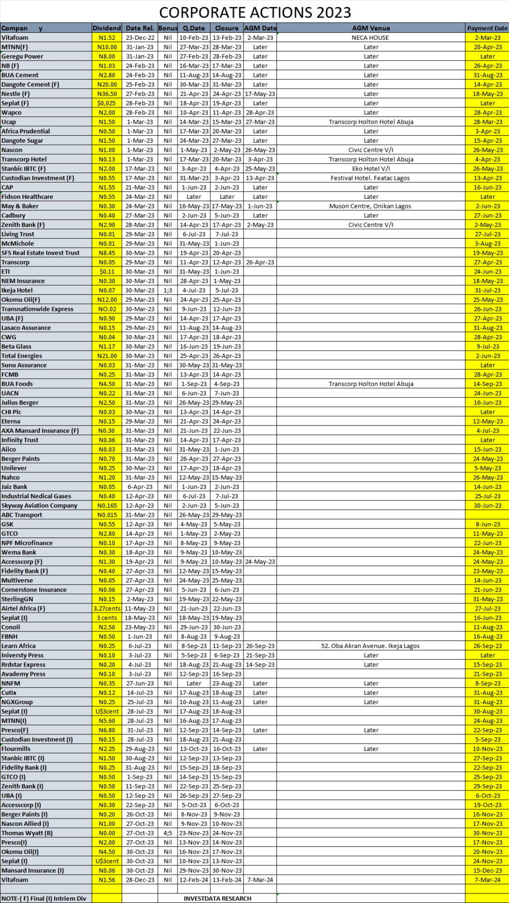 Equities Corporate Actions On NGX As Of Friday, January 26, 2024 Editor January 28, 2024 1 min read 333 Post Views: 80 Continue Reading Previous: Investdata Price, Earnings Tracking For Week Ended January 26, 2024Next: NGX Sustains Bull-Run, Positive Momentum, As Capitalisation Gains N4.3tr WTD Trending Now NGX Ends Bearish On Heavyweight Selloffs Amid Cautious Sentiment 1 NGX Ends Bearish On Heavyweight Selloffs Amid Cautious Sentiment January 23, 2026 Oil Slides as Geopolitical Tensions Ease, But Supply Concerns Linger 2 Oil Slides as Geopolitical Tensions Ease, But Supply Concerns Linger January 23, 2026 BUA Cement, CBMI Seal US$240m Deal For 3mtpa Sokoto Plant Expansion In 20 Months 3 BUA Cement, CBMI Seal US$240m Deal For 3mtpa Sokoto Plant Expansion In 20 Months January 22, 2026 Cautious Bargain Hunting Lifts Equities Marginally Amid Mixed Sector Performance 4 Cautious Bargain Hunting Lifts Equities Marginally Amid Mixed Sector Performance January 22, 2026 Oil Prices Tick Up On Kazakhstan Supply Disruptions 5 Oil Prices Tick Up On Kazakhstan Supply Disruptions January 22, 2026 Nigerian Equities Post Modest Rebound As Bargain Hunting, Oil Strength Support Market 6 Nigerian Equities Post Modest Rebound As Bargain Hunting, Oil Strength Support Market January 21, 2026 Related Stories NGX Ends Bearish On Heavyweight Selloffs Amid Cautious Sentiment 2 min read Equities NGX Ends Bearish On Heavyweight Selloffs Amid Cautious Sentiment January 23, 2026 127 Cautious Bargain Hunting Lifts Equities Marginally Amid Mixed Sector Performance 3 min read Equities Cautious Bargain Hunting Lifts Equities Marginally Amid Mixed Sector Performance January 22, 2026 141 Nigerian Equities Post Modest Rebound As Bargain Hunting, Oil Strength Support Market 3 min read Equities Nigerian Equities Post Modest Rebound As Bargain Hunting, Oil Strength Support Market January 21, 2026 184 Nigerian Equities End Flat-To-Bearish As Profit Taking Offsets Broad Buying, Composite Index Holds Key Support 3 min read Equities Nigerian Equities End Flat-To-Bearish As Profit Taking Offsets Broad Buying, Composite Index Holds Key Support January 20, 2026 192 Corporate Actions On The Nigerian Bourse As Of Friday, January 16, 2026 1 min read Equities Corporate Actions On The Nigerian Bourse As Of Friday, January 16, 2026 January 17, 2026 177 NGX Ends Week Stronger Amid Bullish Trend Despite Profit-Taking, Ahead Of Earnings Inflow 7 min read Equities NGX Ends Week Stronger Amid Bullish Trend Despite Profit-Taking, Ahead Of Earnings Inflow January 17, 2026 224