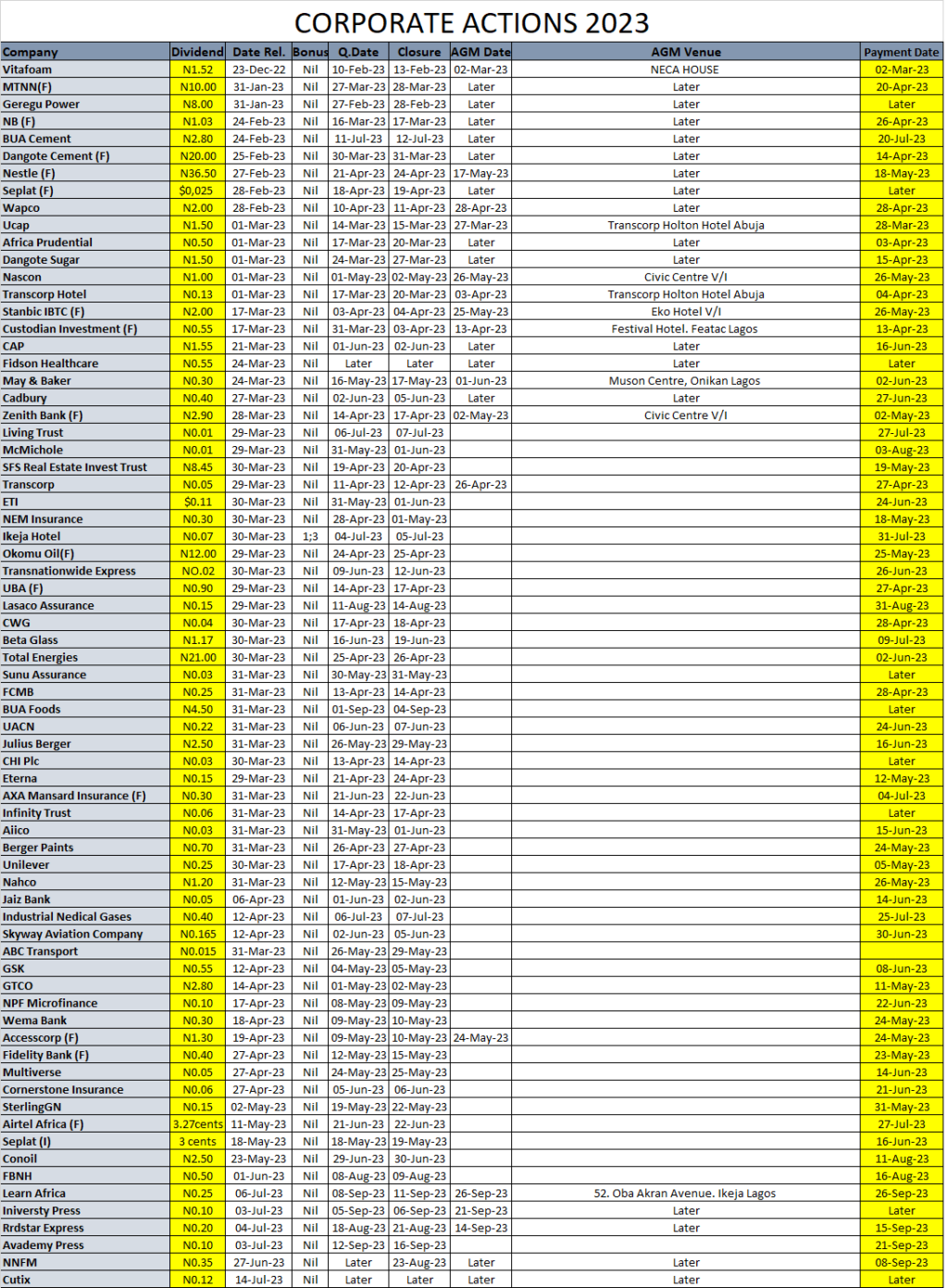 Equities Corporate Actions On NGX As Of Friday, July 14, 2023 Editor July 16, 2023 1 min read 582 Post Views: 55 Continue Reading Previous: Investdata Price, Earnings Tracking For Week Ended July 14, 2023Next: NGX Earnings Season Kick Off Amidst Profit Taking, As Investors Await Ministerial List, MPC Outcome Trending Now NGX Stretches Winning Streak To Seven Sessions As Broad Buying Keeps Bulls In Control 1 NGX Stretches Winning Streak To Seven Sessions As Broad Buying Keeps Bulls In Control December 19, 2025 Otedola Raises First HoldCo Plc Stake To 17.04% In Latest Deals 2 Otedola Raises First HoldCo Plc Stake To 17.04% In Latest Deals December 19, 2025 Shantali Replaces Jalo-Waziri As CEO Of CSCS Plc After 8 Years 3 Shantali Replaces Jalo-Waziri As CEO Of CSCS Plc After 8 Years December 19, 2025 Oil Prices Edge Up on Russia Sanctions Risk and Venezuela Supply Concerns 4 Oil Prices Edge Up on Russia Sanctions Risk and Venezuela Supply Concerns December 19, 2025 Presco Plc Acquires 10,000-Hectare Plantations In Cross River 5 Presco Plc Acquires 10,000-Hectare Plantations In Cross River December 18, 2025 NGX Maintains Uptrend As Investors Accumulate Blue Chips Despite Slower Trading Activity 6 NGX Maintains Uptrend As Investors Accumulate Blue Chips Despite Slower Trading Activity December 18, 2025 Related Stories NGX Stretches Winning Streak To Seven Sessions As Broad Buying Keeps Bulls In Control 3 min read Equities NGX Stretches Winning Streak To Seven Sessions As Broad Buying Keeps Bulls In Control December 19, 2025 111 NGX Maintains Uptrend As Investors Accumulate Blue Chips Despite Slower Trading Activity 3 min read Equities NGX Maintains Uptrend As Investors Accumulate Blue Chips Despite Slower Trading Activity December 18, 2025 129 Cautious Buying Persists As Select Stocks Drive Marginal Market Upside 4 min read Equities Cautious Buying Persists As Select Stocks Drive Marginal Market Upside December 16, 2025 112 NGX Edges Higher Amid Selective Buying, Market Consolidates Near Recent Highs 3 min read Equities NGX Edges Higher Amid Selective Buying, Market Consolidates Near Recent Highs December 15, 2025 167 Corporate Actions On NGX As Of Friday, December 11, 2025 1 min read Equities Corporate Actions On NGX As Of Friday, December 11, 2025 December 13, 2025 188 Nigerian Bourse Rebounds Strongly, Index Gains 0.74% Amid Broad-Based Buying, Market Outlook Turns Firmer 3 min read Equities Nigerian Bourse Rebounds Strongly, Index Gains 0.74% Amid Broad-Based Buying, Market Outlook Turns Firmer December 11, 2025 143