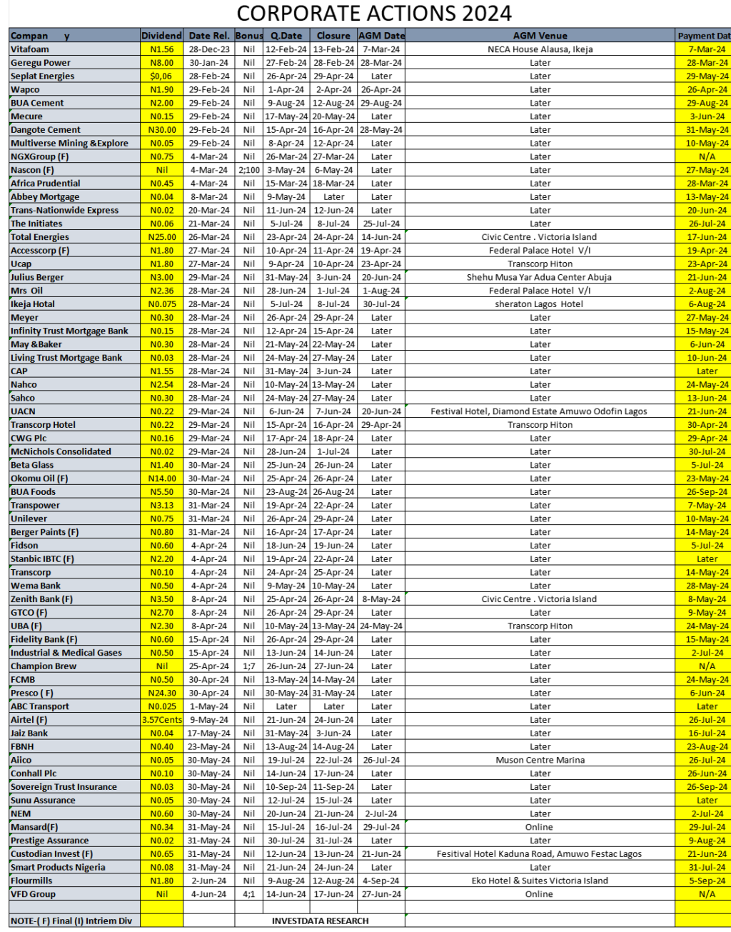 Equities Corporate Actions On NGX As Of Friday, June 21, 2024 Editor June 22, 2024 1 min read 327 Post Views: 116 Continue Reading Previous: Mixed Sentiments Still On NGX, As Low Valuations Enhance Portfolios Repositioning, Div InvestingNext: SEC DG Tasks Businesses On Sustainable, Climate-Friendly Solutions Trending Now Investdata To Offer Tactical Trading Strategy For Higher Returns On NGX At 2026Q1 Master Class 1 Investdata To Offer Tactical Trading Strategy For Higher Returns On NGX At 2026Q1 Master Class December 20, 2025 Corporate Actions On NGX As Of Friday, December 19, 2025 2 Corporate Actions On NGX As Of Friday, December 19, 2025 December 20, 2025 Strong Buying Momentum Lifts NGX Index Above 152,000 Psychological Line On Heavy Volume 3 Strong Buying Momentum Lifts NGX Index Above 152,000 Psychological Line On Heavy Volume December 20, 2025 NGX Stretches Winning Streak To Seven Sessions As Broad Buying Keeps Bulls In Control 4 NGX Stretches Winning Streak To Seven Sessions As Broad Buying Keeps Bulls In Control December 19, 2025 Otedola Raises First HoldCo Plc Stake To 17.04% In Latest Deals 5 Otedola Raises First HoldCo Plc Stake To 17.04% In Latest Deals December 19, 2025 Shantali Replaces Jalo-Waziri As CEO Of CSCS Plc After 8 Years 6 Shantali Replaces Jalo-Waziri As CEO Of CSCS Plc After 8 Years December 19, 2025 Related Stories Corporate Actions On NGX As Of Friday, December 19, 2025 1 min read Equities Corporate Actions On NGX As Of Friday, December 19, 2025 December 20, 2025 34 NGX Stretches Winning Streak To Seven Sessions As Broad Buying Keeps Bulls In Control 3 min read Equities NGX Stretches Winning Streak To Seven Sessions As Broad Buying Keeps Bulls In Control December 19, 2025 122 NGX Maintains Uptrend As Investors Accumulate Blue Chips Despite Slower Trading Activity 3 min read Equities NGX Maintains Uptrend As Investors Accumulate Blue Chips Despite Slower Trading Activity December 18, 2025 135 Cautious Buying Persists As Select Stocks Drive Marginal Market Upside 4 min read Equities Cautious Buying Persists As Select Stocks Drive Marginal Market Upside December 16, 2025 113 NGX Edges Higher Amid Selective Buying, Market Consolidates Near Recent Highs 3 min read Equities NGX Edges Higher Amid Selective Buying, Market Consolidates Near Recent Highs December 15, 2025 167 Corporate Actions On NGX As Of Friday, December 11, 2025 1 min read Equities Corporate Actions On NGX As Of Friday, December 11, 2025 December 13, 2025 191