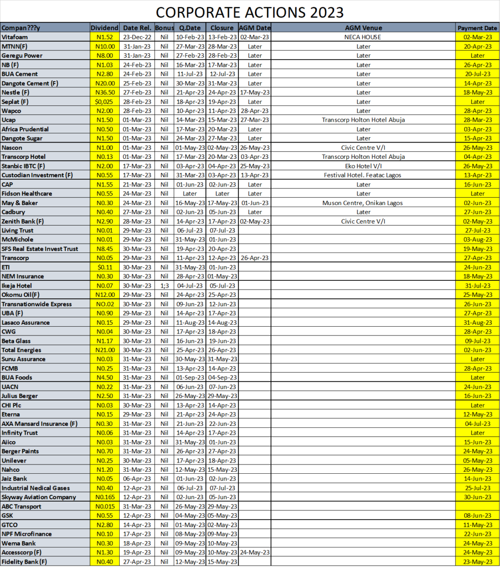 Equities Corporate Actions On NGX As Of Friday, June 23, 2023 Editor June 24, 2023 1 min read 236 Post Views: 60 Continue Reading Previous: Investdata Price, Earnings Tracking For Week Ended June 23, 2023Next: Positive Sentiments Ahead On Quarter-end Window Dressing, Amidst Possible Retracement Trending Now Delayed: Nigerian Bourse Rally Persists as Benchmark Index Gains 1.65% 1 Delayed: Nigerian Bourse Rally Persists as Benchmark Index Gains 1.65% February 11, 2026 Oil Holds Steady Ahead of U.S.-Iran Talks 2 Oil Holds Steady Ahead of U.S.-Iran Talks February 11, 2026 SEC Tasks Civil Servants On Capital Market Investment For Wealth Creation, Retirement Security 3 SEC Tasks Civil Servants On Capital Market Investment For Wealth Creation, Retirement Security February 10, 2026 Nigeria’s Central Banks Approves $150,000 Weekly FX Sale To Retailers 4 Nigeria’s Central Banks Approves $150,000 Weekly FX Sale To Retailers February 10, 2026 Samad Rabiu Charges African Leaders To Move Continent Towards Large-Scale Production 5 Samad Rabiu Charges African Leaders To Move Continent Towards Large-Scale Production February 10, 2026 Japan Vote Propels Stocks, Yen To Fresh Highs, As Takaichi Trade Returns 6 Japan Vote Propels Stocks, Yen To Fresh Highs, As Takaichi Trade Returns February 9, 2026 Related Stories Delayed: Nigerian Bourse Rally Persists as Benchmark Index Gains 1.65% 4 min read Equities Delayed: Nigerian Bourse Rally Persists as Benchmark Index Gains 1.65% February 11, 2026 89 Corporate Actions On Nigerian Bourse As Of February 6, 2026 1 min read Equities Corporate Actions On Nigerian Bourse As Of February 6, 2026 February 9, 2026 136 Delayed: NGX Halts Ranging Market On Positive Reactions To Corporate Earnings Ahead Dividend Announcement 6 min read Equities Delayed: NGX Halts Ranging Market On Positive Reactions To Corporate Earnings Ahead Dividend Announcement February 9, 2026 226 NGX Sustains Bullish Momentum As Seplat Hits Record High On Strong Large-Cap Demand 4 min read Equities NGX Sustains Bullish Momentum As Seplat Hits Record High On Strong Large-Cap Demand February 6, 2026 260 NGX Extends Bullish Momentum Midweek As Banking Heavyweights Drive Rally 3 min read Equities NGX Extends Bullish Momentum Midweek As Banking Heavyweights Drive Rally February 5, 2026 239 Bargain Hunting Keeps Nigerian Bourse In The Green As Banks Lead 3 min read Equities Bargain Hunting Keeps Nigerian Bourse In The Green As Banks Lead February 4, 2026 282