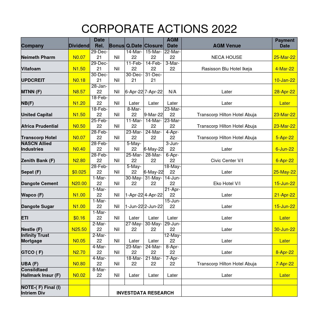 Equities Corporate Actions On NGX As Of Friday, March 11, 2022 March 12, 2022 1 min read 291 Post Views: 336 Continue Reading Previous: Investors Seek Reduced Risk, Position In Dividend Stocks, As NGX Awaits Strong North, Or South PullNext: Investdata Price, Earnings Tracking For Week Ended March 11, 2022 Trending Now Oil Prices Fall On Weaker Demand, Rising Supply 1 Oil Prices Fall On Weaker Demand, Rising Supply February 13, 2026 Nigeria’s Equity Market Maintains Bullish Bias As Selective Buying Drives Gains 2 Nigeria’s Equity Market Maintains Bullish Bias As Selective Buying Drives Gains February 13, 2026 Oil Gains As U.S.–Iran Tensions Offset Inventory Surge 3 Oil Gains As U.S.–Iran Tensions Offset Inventory Surge February 12, 2026 Bullish Momentum Persists As NGX Extends Winning Streak 4 Bullish Momentum Persists As NGX Extends Winning Streak February 12, 2026 Delayed: Nigerian Bourse Rally Persists as Benchmark Index Gains 1.65% 5 Delayed: Nigerian Bourse Rally Persists as Benchmark Index Gains 1.65% February 11, 2026 Oil Holds Steady Ahead of U.S.-Iran Talks 6 Oil Holds Steady Ahead of U.S.-Iran Talks February 11, 2026 Related Stories Nigeria’s Equity Market Maintains Bullish Bias As Selective Buying Drives Gains 3 min read Equities Nigeria’s Equity Market Maintains Bullish Bias As Selective Buying Drives Gains February 13, 2026 61 Oil Gains As U.S.–Iran Tensions Offset Inventory Surge 2 min read Equities Oil Gains As U.S.–Iran Tensions Offset Inventory Surge February 12, 2026 68 Bullish Momentum Persists As NGX Extends Winning Streak 3 min read Equities Bullish Momentum Persists As NGX Extends Winning Streak February 12, 2026 90 Delayed: Nigerian Bourse Rally Persists as Benchmark Index Gains 1.65% 4 min read Equities Delayed: Nigerian Bourse Rally Persists as Benchmark Index Gains 1.65% February 11, 2026 121 Corporate Actions On Nigerian Bourse As Of February 6, 2026 1 min read Equities Corporate Actions On Nigerian Bourse As Of February 6, 2026 February 9, 2026 151 Delayed: NGX Halts Ranging Market On Positive Reactions To Corporate Earnings Ahead Dividend Announcement 6 min read Equities Delayed: NGX Halts Ranging Market On Positive Reactions To Corporate Earnings Ahead Dividend Announcement February 9, 2026 235