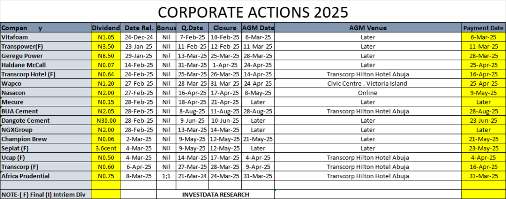 Equities Corporate Actions On NGX As Of Friday, March 14, 2025 Editor March 16, 2025 1 min read 279 Post Views: 100 Continue Reading Previous: Trading Volume Rises, NGX Index Dips 0.55%Next: Mixed Sentiments Yet As Investors Digest Feb. Inflation Data Amid Portfolio Reshuffling Trending Now Nigerian Bourse Ranges On Profit Taking Ahead Earnings Expectations, Sector Rotation 1 Nigerian Bourse Ranges On Profit Taking Ahead Earnings Expectations, Sector Rotation January 24, 2026 Corporate Actions On NGX As Of Friday, January 23, 2026 2 Corporate Actions On NGX As Of Friday, January 23, 2026 January 24, 2026 NGX Ends Week On Cautious Positive Note As Selective Buying Offsets Profit-Taking Pressures 3 NGX Ends Week On Cautious Positive Note As Selective Buying Offsets Profit-Taking Pressures January 24, 2026 NGX Ends Bearish On Heavyweight Selloffs Amid Cautious Sentiment 4 NGX Ends Bearish On Heavyweight Selloffs Amid Cautious Sentiment January 23, 2026 Oil Slides as Geopolitical Tensions Ease, But Supply Concerns Linger 5 Oil Slides as Geopolitical Tensions Ease, But Supply Concerns Linger January 23, 2026 BUA Cement, CBMI Seal US$240m Deal For 3mtpa Sokoto Plant Expansion In 20 Months 6 BUA Cement, CBMI Seal US$240m Deal For 3mtpa Sokoto Plant Expansion In 20 Months January 22, 2026 Related Stories Corporate Actions On NGX As Of Friday, January 23, 2026 1 min read Equities Corporate Actions On NGX As Of Friday, January 23, 2026 January 24, 2026 24 NGX Ends Week On Cautious Positive Note As Selective Buying Offsets Profit-Taking Pressures 3 min read Equities NGX Ends Week On Cautious Positive Note As Selective Buying Offsets Profit-Taking Pressures January 24, 2026 36 NGX Ends Bearish On Heavyweight Selloffs Amid Cautious Sentiment 2 min read Equities NGX Ends Bearish On Heavyweight Selloffs Amid Cautious Sentiment January 23, 2026 138 Cautious Bargain Hunting Lifts Equities Marginally Amid Mixed Sector Performance 3 min read Equities Cautious Bargain Hunting Lifts Equities Marginally Amid Mixed Sector Performance January 22, 2026 148 Nigerian Equities Post Modest Rebound As Bargain Hunting, Oil Strength Support Market 3 min read Equities Nigerian Equities Post Modest Rebound As Bargain Hunting, Oil Strength Support Market January 21, 2026 189 Nigerian Equities End Flat-To-Bearish As Profit Taking Offsets Broad Buying, Composite Index Holds Key Support 3 min read Equities Nigerian Equities End Flat-To-Bearish As Profit Taking Offsets Broad Buying, Composite Index Holds Key Support January 20, 2026 195