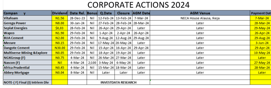 Equities Corporate Actions On NGX As Of Friday, March 15, 2024 Editor March 16, 2024 1 min read 288 Post Views: 126 Continue Reading Previous: Investdata Price, Earnings Tracking For Week Ended March 15, 2024Next: Mixed Sentiment On NGX, As Inflation Hits 28-Year High In Nigeria, Amid Higher Yields Outlook Trending Now Nigerian Bourse Ranges On Profit Taking Ahead Earnings Expectations, Sector Rotation 1 Nigerian Bourse Ranges On Profit Taking Ahead Earnings Expectations, Sector Rotation January 24, 2026 Corporate Actions On NGX As Of Friday, January 23, 2026 2 Corporate Actions On NGX As Of Friday, January 23, 2026 January 24, 2026 NGX Ends Week On Cautious Positive Note As Selective Buying Offsets Profit-Taking Pressures 3 NGX Ends Week On Cautious Positive Note As Selective Buying Offsets Profit-Taking Pressures January 24, 2026 NGX Ends Bearish On Heavyweight Selloffs Amid Cautious Sentiment 4 NGX Ends Bearish On Heavyweight Selloffs Amid Cautious Sentiment January 23, 2026 Oil Slides as Geopolitical Tensions Ease, But Supply Concerns Linger 5 Oil Slides as Geopolitical Tensions Ease, But Supply Concerns Linger January 23, 2026 BUA Cement, CBMI Seal US$240m Deal For 3mtpa Sokoto Plant Expansion In 20 Months 6 BUA Cement, CBMI Seal US$240m Deal For 3mtpa Sokoto Plant Expansion In 20 Months January 22, 2026 Related Stories Corporate Actions On NGX As Of Friday, January 23, 2026 1 min read Equities Corporate Actions On NGX As Of Friday, January 23, 2026 January 24, 2026 20 NGX Ends Week On Cautious Positive Note As Selective Buying Offsets Profit-Taking Pressures 3 min read Equities NGX Ends Week On Cautious Positive Note As Selective Buying Offsets Profit-Taking Pressures January 24, 2026 29 NGX Ends Bearish On Heavyweight Selloffs Amid Cautious Sentiment 2 min read Equities NGX Ends Bearish On Heavyweight Selloffs Amid Cautious Sentiment January 23, 2026 136 Cautious Bargain Hunting Lifts Equities Marginally Amid Mixed Sector Performance 3 min read Equities Cautious Bargain Hunting Lifts Equities Marginally Amid Mixed Sector Performance January 22, 2026 147 Nigerian Equities Post Modest Rebound As Bargain Hunting, Oil Strength Support Market 3 min read Equities Nigerian Equities Post Modest Rebound As Bargain Hunting, Oil Strength Support Market January 21, 2026 189 Nigerian Equities End Flat-To-Bearish As Profit Taking Offsets Broad Buying, Composite Index Holds Key Support 3 min read Equities Nigerian Equities End Flat-To-Bearish As Profit Taking Offsets Broad Buying, Composite Index Holds Key Support January 20, 2026 195