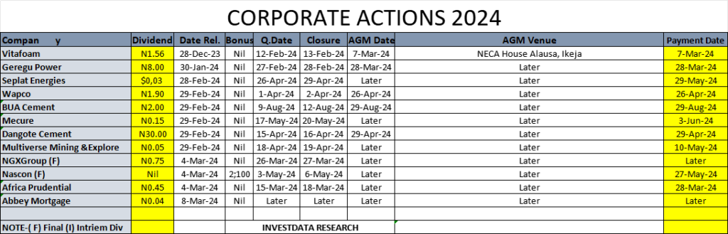Equities Corporate Actions On NGX As Of Friday, March 8, 2024 Editor March 9, 2024 1 min read 375 Post Views: 151 Continue Reading Previous: Investdata Price, Earnings Tracking For Week Ended March 8, 2024Next: Positive Sentiments On NGX, Amid New Listing, Higher Yields Ahead Of Feb Inflation Data Trending Now Oil Slips As U.S–Iran Talks Ease Tensions 1 Oil Slips As U.S–Iran Talks Ease Tensions February 18, 2026 NGX Retreats On Profit-Taking As Banking Heavyweights Weigh In 2 NGX Retreats On Profit-Taking As Banking Heavyweights Weigh In February 18, 2026 Photo News: BUA Group, MAIR Sign MoU To Partner In Sugar Refining, Agro-Industrial Development 3 Photo News: BUA Group, MAIR Sign MoU To Partner In Sugar Refining, Agro-Industrial Development February 17, 2026 Oil Edges Higher As U.S–Iran Talks Offset OPEC+ Supply Outlook 4 Oil Edges Higher As U.S–Iran Talks Offset OPEC+ Supply Outlook February 17, 2026 Equities Rally Deepens As Nigeria’s Composite Index Hits Fresh All-Time High On Broad-Based Buying Pressure 5 Equities Rally Deepens As Nigeria’s Composite Index Hits Fresh All-Time High On Broad-Based Buying Pressure February 17, 2026 Oil Rises Slightly As Softer U.S. Inflation Offsets Supply Concerns 6 Oil Rises Slightly As Softer U.S. Inflation Offsets Supply Concerns February 16, 2026 Related Stories NGX Retreats On Profit-Taking As Banking Heavyweights Weigh In 3 min read Equities NGX Retreats On Profit-Taking As Banking Heavyweights Weigh In February 18, 2026 87 Equities Rally Deepens As Nigeria’s Composite Index Hits Fresh All-Time High On Broad-Based Buying Pressure 4 min read Equities Equities Rally Deepens As Nigeria’s Composite Index Hits Fresh All-Time High On Broad-Based Buying Pressure February 17, 2026 132 Corporate Actions On Nigerian Bourse As Of Friday, February 13, 2026 1 min read Equities Corporate Actions On Nigerian Bourse As Of Friday, February 13, 2026 February 16, 2026 128 NGX Closes Week Strong As Blue Chips Drive Composite Index Higher 3 min read Equities NGX Closes Week Strong As Blue Chips Drive Composite Index Higher February 13, 2026 279 Nigeria’s Equity Market Maintains Bullish Bias As Selective Buying Drives Gains 3 min read Equities Nigeria’s Equity Market Maintains Bullish Bias As Selective Buying Drives Gains February 13, 2026 179 Oil Gains As U.S.–Iran Tensions Offset Inventory Surge 2 min read Equities Oil Gains As U.S.–Iran Tensions Offset Inventory Surge February 12, 2026 160
