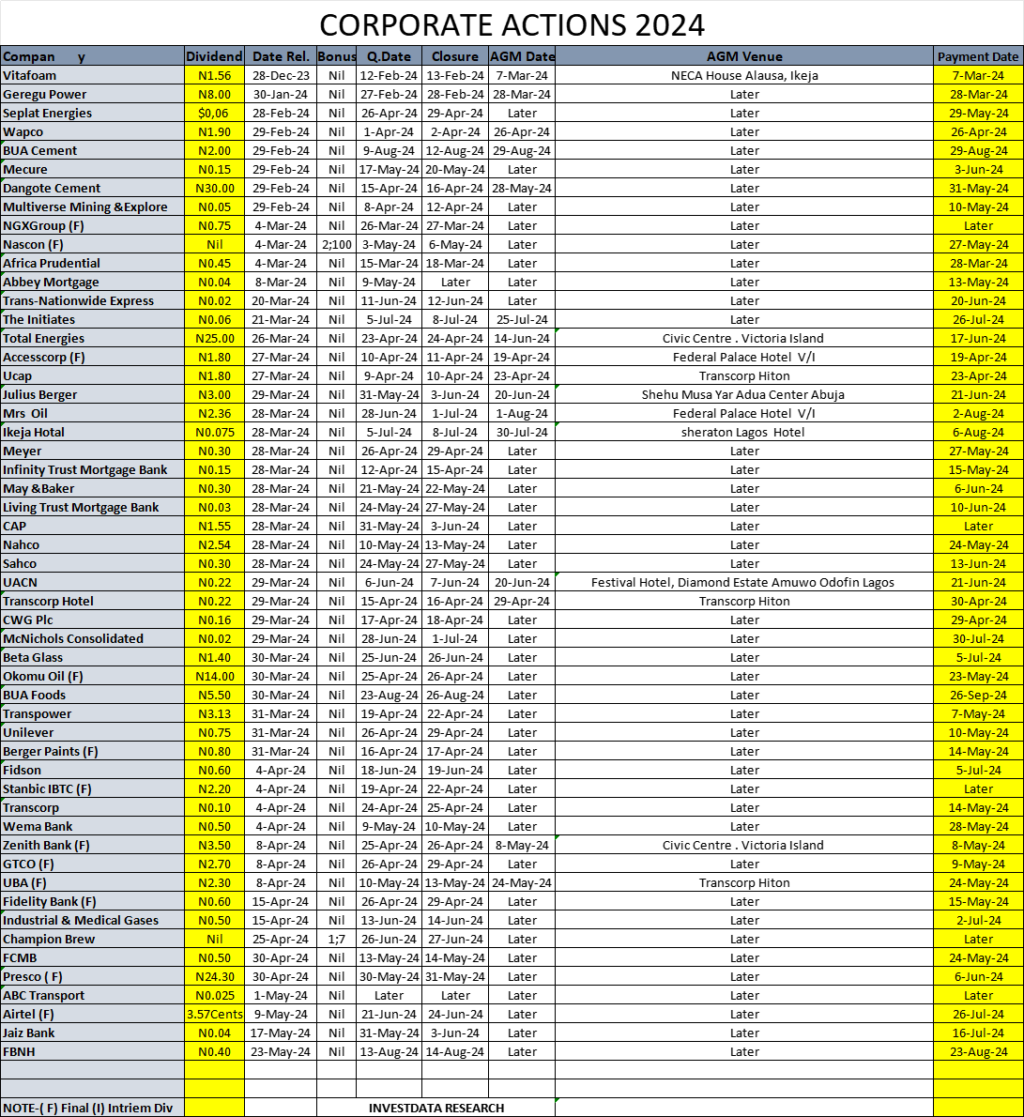 Equities Corporate Actions On NGX As Of Friday, May 24, 2024 Editor May 27, 2024 1 min read 356 Post Views: 89 Continue Reading Previous: Investdata Price, Earnings Tracking For Week Ended May 24, 2024Next: NGX In Mixed Mood, Amid Portfolio Realignment On Low Valuations, Q1 Earnings Inflow Trending Now NGX Ends Christmas Eve Higher As Banking, Consumer Stocks Advance 1 NGX Ends Christmas Eve Higher As Banking, Consumer Stocks Advance December 24, 2025 NGX Sustains Bullish Momentum As Buying Pressure Keeps Market On The Upside 2 NGX Sustains Bullish Momentum As Buying Pressure Keeps Market On The Upside December 23, 2025 NGX Extends Rally As Sector Rotation Persists 3 NGX Extends Rally As Sector Rotation Persists December 23, 2025 Oil Prices Edge Higher On Venezuela, Ukraine Tensions 4 Oil Prices Edge Higher On Venezuela, Ukraine Tensions December 23, 2025 SEC Nigeria Gives Capital Market Operators January 31 Deadline To Renew Registration 5 SEC Nigeria Gives Capital Market Operators January 31 Deadline To Renew Registration December 21, 2025 Investdata To Offer Tactical Trading Strategy For Higher Returns On NGX At 2026Q1 Master Class 6 Investdata To Offer Tactical Trading Strategy For Higher Returns On NGX At 2026Q1 Master Class December 20, 2025 Related Stories NGX Ends Christmas Eve Higher As Banking, Consumer Stocks Advance 5 min read Equities NGX Ends Christmas Eve Higher As Banking, Consumer Stocks Advance December 24, 2025 27 NGX Sustains Bullish Momentum As Buying Pressure Keeps Market On The Upside 5 min read Equities NGX Sustains Bullish Momentum As Buying Pressure Keeps Market On The Upside December 23, 2025 86 NGX Extends Rally As Sector Rotation Persists 5 min read Equities NGX Extends Rally As Sector Rotation Persists December 23, 2025 96 Corporate Actions On NGX As Of Friday, December 19, 2025 1 min read Equities Corporate Actions On NGX As Of Friday, December 19, 2025 December 20, 2025 111 NGX Stretches Winning Streak To Seven Sessions As Broad Buying Keeps Bulls In Control 3 min read Equities NGX Stretches Winning Streak To Seven Sessions As Broad Buying Keeps Bulls In Control December 19, 2025 201 NGX Maintains Uptrend As Investors Accumulate Blue Chips Despite Slower Trading Activity 3 min read Equities NGX Maintains Uptrend As Investors Accumulate Blue Chips Despite Slower Trading Activity December 18, 2025 185