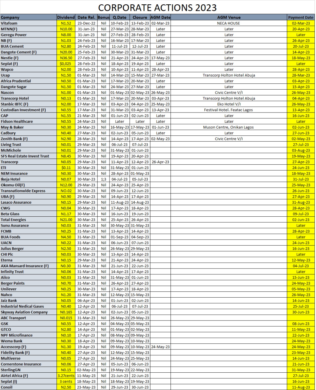 Equities Corporate Actions On NGX As Of Friday, May 26, 2023 Editor May 28, 2023 1 min read 352 Post Views: 132 Continue Reading Previous: Investdata Price, Earnings Tracking For Week Ended May 26, 2023Next: Mixed Sentiments Ahead, As Investors Expect Economic Agenda, Policy Directions From New Govt Trending Now NGX Edges Higher Amid Selective Buying, Market Consolidates Near Recent Highs 1 NGX Edges Higher Amid Selective Buying, Market Consolidates Near Recent Highs December 15, 2025 BUA Group Doles Out ₦30bn Cash Awards To 510 Employees 2 BUA Group Doles Out ₦30bn Cash Awards To 510 Employees December 15, 2025 Oil Prices Slide On Oversupply Concerns, Post 4% Weekly Loss 3 Oil Prices Slide On Oversupply Concerns, Post 4% Weekly Loss December 15, 2025 Nigerian Index Extends Two-Week Strong Buying Interests On Low Cap Stocks, Blue-Chip Gains 4 Nigerian Index Extends Two-Week Strong Buying Interests On Low Cap Stocks, Blue-Chip Gains December 13, 2025 Corporate Actions On NGX As Of Friday, December 11, 2025 5 Corporate Actions On NGX As Of Friday, December 11, 2025 December 13, 2025 FCMB Group Plc: Still Undervalued Despite Growing Profit , Greater Efficiency, Resilience 6 FCMB Group Plc: Still Undervalued Despite Growing Profit , Greater Efficiency, Resilience December 12, 2025 Related Stories NGX Edges Higher Amid Selective Buying, Market Consolidates Near Recent Highs 3 min read Equities NGX Edges Higher Amid Selective Buying, Market Consolidates Near Recent Highs December 15, 2025 35 Corporate Actions On NGX As Of Friday, December 11, 2025 1 min read Equities Corporate Actions On NGX As Of Friday, December 11, 2025 December 13, 2025 95 Nigerian Bourse Rebounds Strongly, Index Gains 0.74% Amid Broad-Based Buying, Market Outlook Turns Firmer 3 min read Equities Nigerian Bourse Rebounds Strongly, Index Gains 0.74% Amid Broad-Based Buying, Market Outlook Turns Firmer December 11, 2025 111 NGX Index Slips Again As Broad Profit-Taking Persists, Investors Brace For Year-End Rebalancing 3 min read Equities NGX Index Slips Again As Broad Profit-Taking Persists, Investors Brace For Year-End Rebalancing December 10, 2025 63 Nigeria’s NGX Slips As Profit Taking Halts Rally Amid Cautious Investor Sentiments 3 min read Equities Nigeria’s NGX Slips As Profit Taking Halts Rally Amid Cautious Investor Sentiments December 9, 2025 36 Nigeria’s NGX Opens Week Strong As Bulls Tighten Grip, Banking Stocks Lead Momentum 4 min read Equities Nigeria’s NGX Opens Week Strong As Bulls Tighten Grip, Banking Stocks Lead Momentum December 9, 2025 13