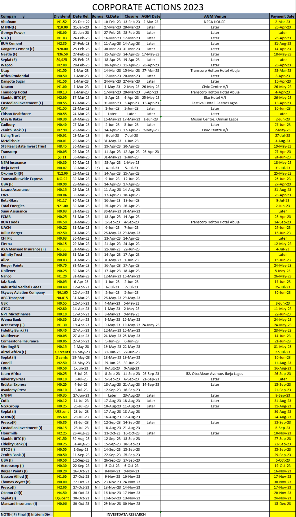 Equities Corporate Actions On NGX As Of Friday, November 3, 2023 Editor November 4, 2023 1 min read 195 Post Views: 46 Continue Reading Previous: Investdata Price, Earnings Tracking For Week Ended November 3, 2023Next: Expect Mixed Trends Amid Positioning For Higher Full=Year Dividend, Profit Taking Trending Now Photo News: BUA Group, MAIR Sign MoU To Partner In Sugar Refining, Agro-Industrial Development 1 Photo News: BUA Group, MAIR Sign MoU To Partner In Sugar Refining, Agro-Industrial Development February 17, 2026 Oil Edges Higher As U.S–Iran Talks Offset OPEC+ Supply Outlook 2 Oil Edges Higher As U.S–Iran Talks Offset OPEC+ Supply Outlook February 17, 2026 Equities Rally Deepens As Nigeria’s Composite Index Hits Fresh All-Time High On Broad-Based Buying Pressure 3 Equities Rally Deepens As Nigeria’s Composite Index Hits Fresh All-Time High On Broad-Based Buying Pressure February 17, 2026 Oil Rises Slightly As Softer U.S. Inflation Offsets Supply Concerns 4 Oil Rises Slightly As Softer U.S. Inflation Offsets Supply Concerns February 16, 2026 Photo News: Pencom, SEC Nigeria, NGX, Dangote Group, Others In Talks To Deepen Market Liquidity, Reforms 5 Photo News: Pencom, SEC Nigeria, NGX, Dangote Group, Others In Talks To Deepen Market Liquidity, Reforms February 16, 2026 Strong Fundamentals, Balance Sheet Quality, Profit Make Nigeria’s Wema Bank Stock To Watch 6 Strong Fundamentals, Balance Sheet Quality, Profit Make Nigeria’s Wema Bank Stock To Watch February 16, 2026 Related Stories Equities Rally Deepens As Nigeria’s Composite Index Hits Fresh All-Time High On Broad-Based Buying Pressure 4 min read Equities Equities Rally Deepens As Nigeria’s Composite Index Hits Fresh All-Time High On Broad-Based Buying Pressure February 17, 2026 82 Corporate Actions On Nigerian Bourse As Of Friday, February 13, 2026 1 min read Equities Corporate Actions On Nigerian Bourse As Of Friday, February 13, 2026 February 16, 2026 93 NGX Closes Week Strong As Blue Chips Drive Composite Index Higher 3 min read Equities NGX Closes Week Strong As Blue Chips Drive Composite Index Higher February 13, 2026 258 Nigeria’s Equity Market Maintains Bullish Bias As Selective Buying Drives Gains 3 min read Equities Nigeria’s Equity Market Maintains Bullish Bias As Selective Buying Drives Gains February 13, 2026 175 Oil Gains As U.S.–Iran Tensions Offset Inventory Surge 2 min read Equities Oil Gains As U.S.–Iran Tensions Offset Inventory Surge February 12, 2026 156 Bullish Momentum Persists As NGX Extends Winning Streak 3 min read Equities Bullish Momentum Persists As NGX Extends Winning Streak February 12, 2026 185