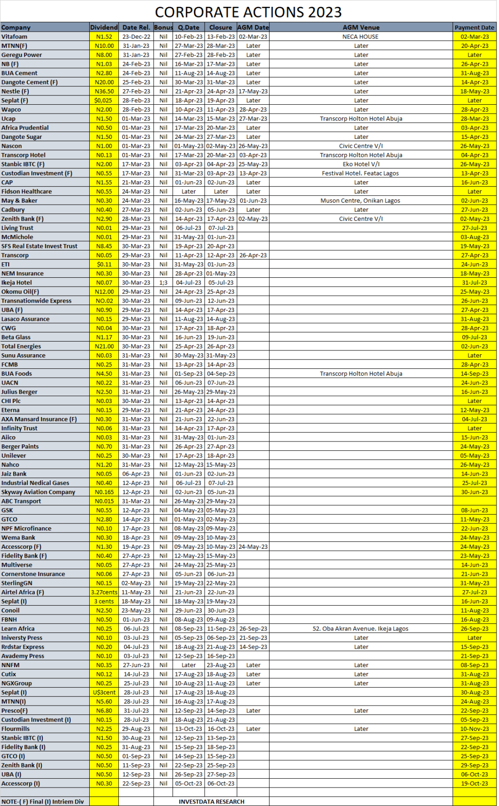 Equities Corporate Actions On NGX As Of Friday, October 6, 2023 Editor October 9, 2023 1 min read 331 Post Views: 126 Continue Reading Previous: Mixed Sentiments, Mild Bull-run Ahead, On Bargain Hunting, As Investors Await Q3 Earnings InflowNext: Investdata Price, Earnings Tracking For Week Ended October 6, 2023 Trending Now Nigerian Index Extends Two-Week Strong Buying Interests On Low Cap Stocks, Blue-Chip Gains 1 Nigerian Index Extends Two-Week Strong Buying Interests On Low Cap Stocks, Blue-Chip Gains December 13, 2025 Corporate Actions On NGX As Of Friday, December 11, 2025 2 Corporate Actions On NGX As Of Friday, December 11, 2025 December 13, 2025 FCMB Group Plc: Still Undervalued Despite Growing Profit , Greater Efficiency, Resilience 3 FCMB Group Plc: Still Undervalued Despite Growing Profit , Greater Efficiency, Resilience December 12, 2025 Oil Prices Slip As Market Watches Russia-Ukraine Peace Talks 4 Oil Prices Slip As Market Watches Russia-Ukraine Peace Talks December 12, 2025 Nigerian Bourse Rebounds Strongly, Index Gains 0.74% Amid Broad-Based Buying, Market Outlook Turns Firmer 5 Nigerian Bourse Rebounds Strongly, Index Gains 0.74% Amid Broad-Based Buying, Market Outlook Turns Firmer December 11, 2025 Oil Prices Steady Ahead Of U.S. Rate Decision, Ukraine Peace Talks 6 Oil Prices Steady Ahead Of U.S. Rate Decision, Ukraine Peace Talks December 11, 2025 Related Stories Corporate Actions On NGX As Of Friday, December 11, 2025 1 min read Equities Corporate Actions On NGX As Of Friday, December 11, 2025 December 13, 2025 37 Nigerian Bourse Rebounds Strongly, Index Gains 0.74% Amid Broad-Based Buying, Market Outlook Turns Firmer 3 min read Equities Nigerian Bourse Rebounds Strongly, Index Gains 0.74% Amid Broad-Based Buying, Market Outlook Turns Firmer December 11, 2025 63 NGX Index Slips Again As Broad Profit-Taking Persists, Investors Brace For Year-End Rebalancing 3 min read Equities NGX Index Slips Again As Broad Profit-Taking Persists, Investors Brace For Year-End Rebalancing December 10, 2025 34 Nigeria’s NGX Slips As Profit Taking Halts Rally Amid Cautious Investor Sentiments 3 min read Equities Nigeria’s NGX Slips As Profit Taking Halts Rally Amid Cautious Investor Sentiments December 9, 2025 25 Nigeria’s NGX Opens Week Strong As Bulls Tighten Grip, Banking Stocks Lead Momentum 4 min read Equities Nigeria’s NGX Opens Week Strong As Bulls Tighten Grip, Banking Stocks Lead Momentum December 9, 2025 9 Corporate Actions On Nigeran Exchange As Of Friday, December 5, 2025 1 min read Equities Corporate Actions On Nigeran Exchange As Of Friday, December 5, 2025 December 6, 2025 4