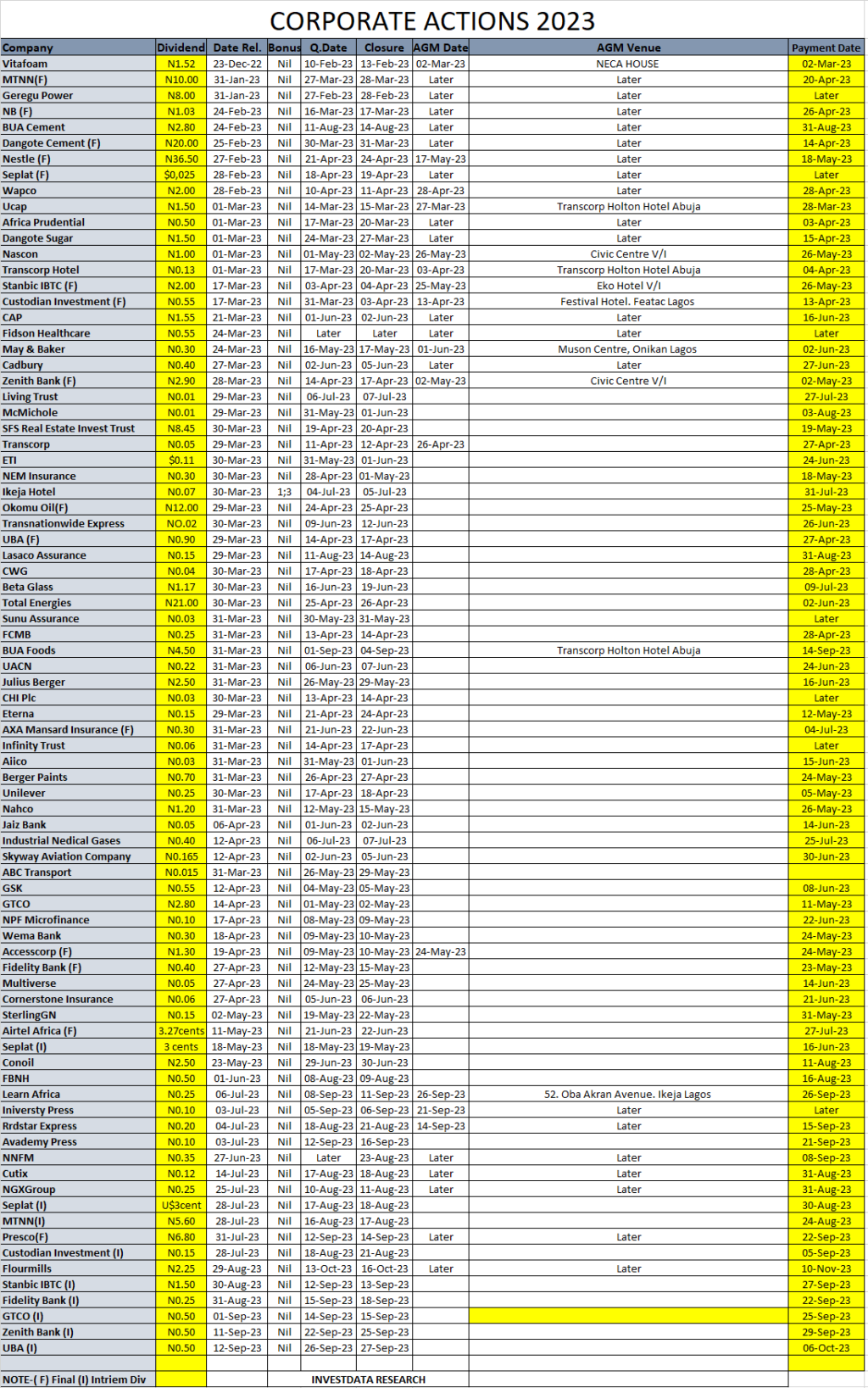 Equities Corporate Actions On NGX As Of Friday, September 15, 2023 Editor September 16, 2023 1 min read 737 Post Views: 143 Continue Reading Previous: Investdata Price, Earnings Tracking For Week Ended September 15, 2023Next: Expect Mixed Sentiments On Corporate Actions, Bargain Hunting, Ahead Of Q3 Filings, MPC Outcome Trending Now Nigerian Bourse Ranges On Profit Taking Ahead Earnings Expectations, Sector Rotation 1 Nigerian Bourse Ranges On Profit Taking Ahead Earnings Expectations, Sector Rotation January 24, 2026 Corporate Actions On NGX As Of Friday, January 23, 2026 2 Corporate Actions On NGX As Of Friday, January 23, 2026 January 24, 2026 NGX Ends Week On Cautious Positive Note As Selective Buying Offsets Profit-Taking Pressures 3 NGX Ends Week On Cautious Positive Note As Selective Buying Offsets Profit-Taking Pressures January 24, 2026 NGX Ends Bearish On Heavyweight Selloffs Amid Cautious Sentiment 4 NGX Ends Bearish On Heavyweight Selloffs Amid Cautious Sentiment January 23, 2026 Oil Slides as Geopolitical Tensions Ease, But Supply Concerns Linger 5 Oil Slides as Geopolitical Tensions Ease, But Supply Concerns Linger January 23, 2026 BUA Cement, CBMI Seal US$240m Deal For 3mtpa Sokoto Plant Expansion In 20 Months 6 BUA Cement, CBMI Seal US$240m Deal For 3mtpa Sokoto Plant Expansion In 20 Months January 22, 2026 Related Stories Corporate Actions On NGX As Of Friday, January 23, 2026 1 min read Equities Corporate Actions On NGX As Of Friday, January 23, 2026 January 24, 2026 42 NGX Ends Week On Cautious Positive Note As Selective Buying Offsets Profit-Taking Pressures 3 min read Equities NGX Ends Week On Cautious Positive Note As Selective Buying Offsets Profit-Taking Pressures January 24, 2026 56 NGX Ends Bearish On Heavyweight Selloffs Amid Cautious Sentiment 2 min read Equities NGX Ends Bearish On Heavyweight Selloffs Amid Cautious Sentiment January 23, 2026 145 Cautious Bargain Hunting Lifts Equities Marginally Amid Mixed Sector Performance 3 min read Equities Cautious Bargain Hunting Lifts Equities Marginally Amid Mixed Sector Performance January 22, 2026 155 Nigerian Equities Post Modest Rebound As Bargain Hunting, Oil Strength Support Market 3 min read Equities Nigerian Equities Post Modest Rebound As Bargain Hunting, Oil Strength Support Market January 21, 2026 191 Nigerian Equities End Flat-To-Bearish As Profit Taking Offsets Broad Buying, Composite Index Holds Key Support 3 min read Equities Nigerian Equities End Flat-To-Bearish As Profit Taking Offsets Broad Buying, Composite Index Holds Key Support January 20, 2026 195