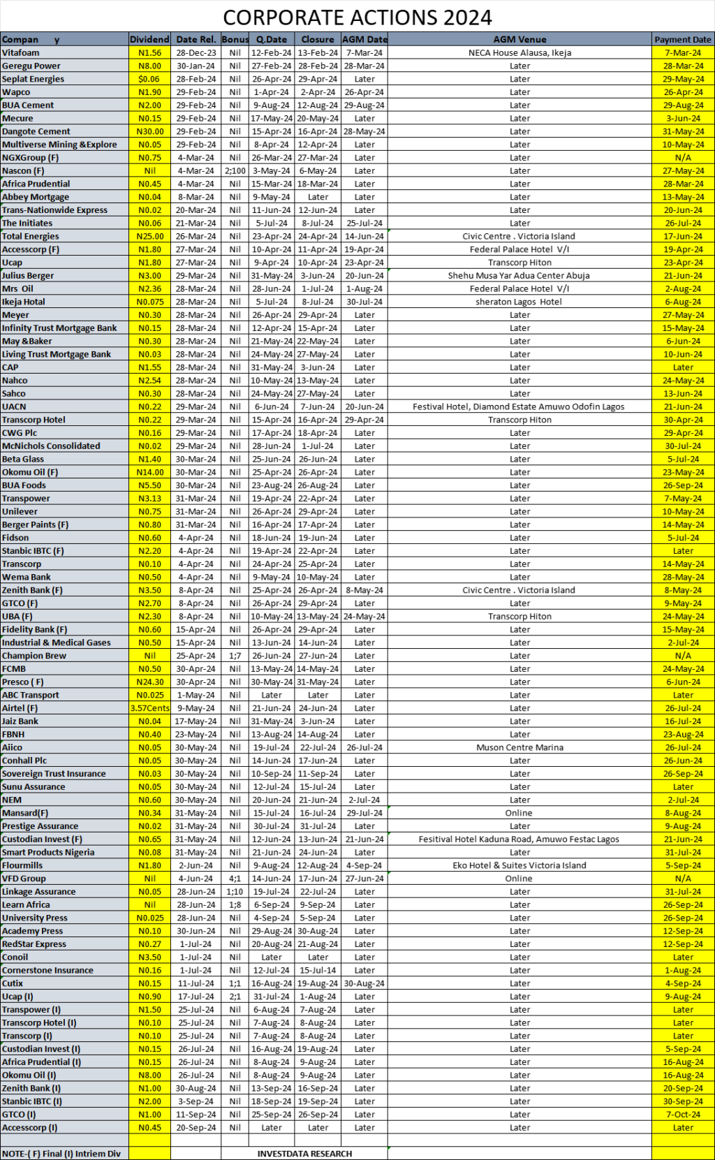 Equities Corporate Actions On NGX As Of Friday, September 20, 2024 Editor September 21, 2024 1 min read 263 Post Views: 163 Continue Reading Previous: Investdata Price, Earnings Tracking For Week Ended September 20, 2024Next: NGX Extends Bullish Momentum Ahead Of MPC Meeting, Quarter-End Window Dressing Trending Now SEC Nigeria Gives Capital Market Operators January 31 Deadline To Renew Registration 1 SEC Nigeria Gives Capital Market Operators January 31 Deadline To Renew Registration December 21, 2025 Investdata To Offer Tactical Trading Strategy For Higher Returns On NGX At 2026Q1 Master Class 2 Investdata To Offer Tactical Trading Strategy For Higher Returns On NGX At 2026Q1 Master Class December 20, 2025 Corporate Actions On NGX As Of Friday, December 19, 2025 3 Corporate Actions On NGX As Of Friday, December 19, 2025 December 20, 2025 Strong Buying Momentum Lifts NGX Index Above 152,000 Psychological Line On Heavy Volume 4 Strong Buying Momentum Lifts NGX Index Above 152,000 Psychological Line On Heavy Volume December 20, 2025 NGX Stretches Winning Streak To Seven Sessions As Broad Buying Keeps Bulls In Control 5 NGX Stretches Winning Streak To Seven Sessions As Broad Buying Keeps Bulls In Control December 19, 2025 Otedola Raises First HoldCo Plc Stake To 17.04% In Latest Deals 6 Otedola Raises First HoldCo Plc Stake To 17.04% In Latest Deals December 19, 2025 Related Stories Corporate Actions On NGX As Of Friday, December 19, 2025 1 min read Equities Corporate Actions On NGX As Of Friday, December 19, 2025 December 20, 2025 70 NGX Stretches Winning Streak To Seven Sessions As Broad Buying Keeps Bulls In Control 3 min read Equities NGX Stretches Winning Streak To Seven Sessions As Broad Buying Keeps Bulls In Control December 19, 2025 162 NGX Maintains Uptrend As Investors Accumulate Blue Chips Despite Slower Trading Activity 3 min read Equities NGX Maintains Uptrend As Investors Accumulate Blue Chips Despite Slower Trading Activity December 18, 2025 164 Cautious Buying Persists As Select Stocks Drive Marginal Market Upside 4 min read Equities Cautious Buying Persists As Select Stocks Drive Marginal Market Upside December 16, 2025 116 NGX Edges Higher Amid Selective Buying, Market Consolidates Near Recent Highs 3 min read Equities NGX Edges Higher Amid Selective Buying, Market Consolidates Near Recent Highs December 15, 2025 169 Corporate Actions On NGX As Of Friday, December 11, 2025 1 min read Equities Corporate Actions On NGX As Of Friday, December 11, 2025 December 13, 2025 201