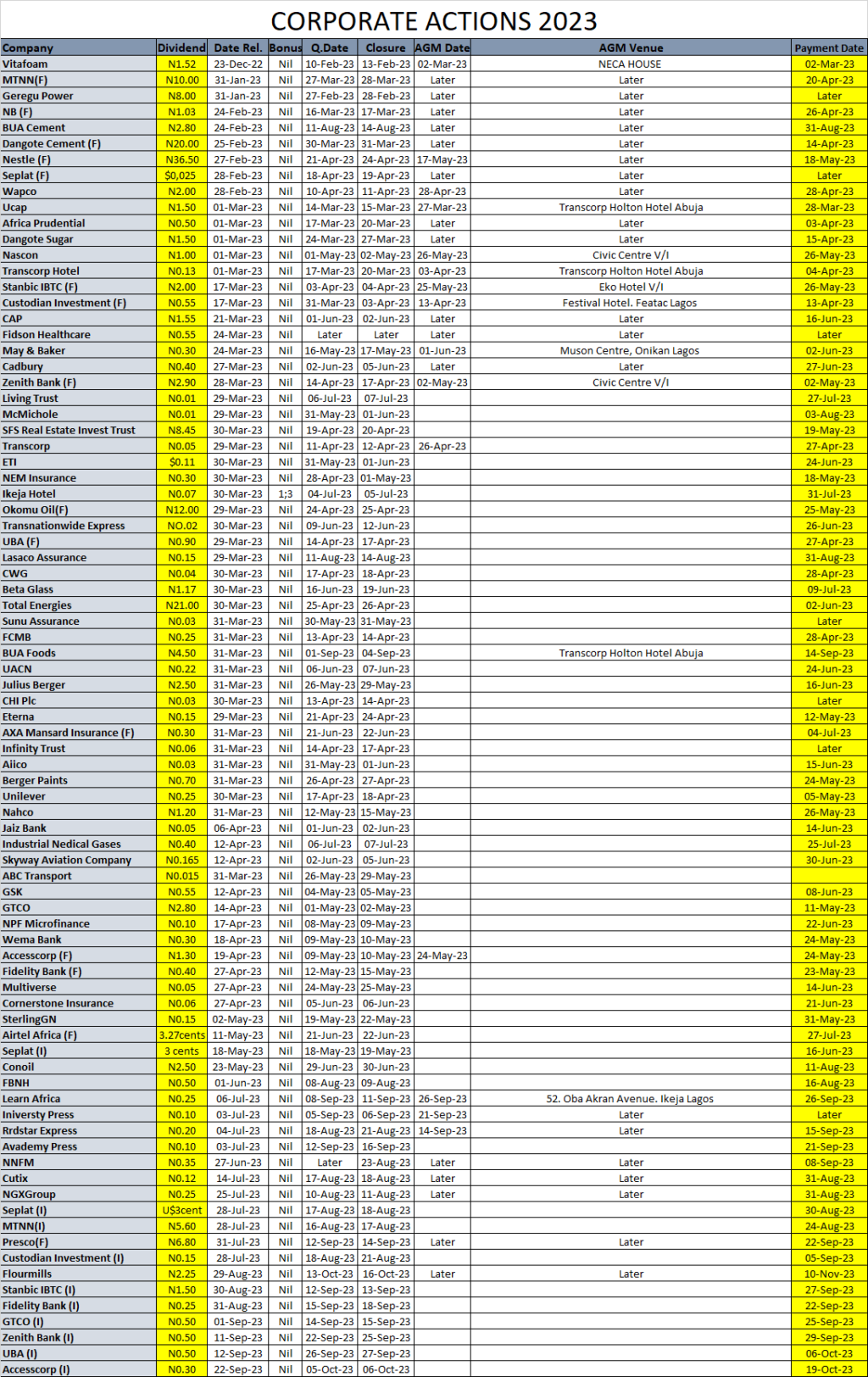 Equities Corporate Actions On NGX As Of Friday, September 22, 2023 Editor September 23, 2023 1 min read 327 Post Views: 45 Continue Reading Previous: Investdata Price, Earnings Tracking For Week Ended September 22, 2023Next: Mixed Sentiment, Bargain Hunting, Revaluation,Ahead Of Q3 Earnings Reports Inflow Market Update for the Week Trending Now NGX Consolidates As Bargain Hunting Counters Profit-Taking Amid Weak Volume 1 NGX Consolidates As Bargain Hunting Counters Profit-Taking Amid Weak Volume January 27, 2026 Oil Prices Steady But Supply Risks Persist 2 Oil Prices Steady But Supply Risks Persist January 27, 2026 Gold smashes $5,000, will it get to $6,000 this year? 3 Gold smashes $5,000, will it get to $6,000 this year? January 27, 2026 Bank Liquidation: NDIC, EFCC Agree Stronger Partnership For Asset Recovery, Prosecution Of Offenders 4 Bank Liquidation: NDIC, EFCC Agree Stronger Partnership For Asset Recovery, Prosecution Of Offenders January 26, 2026 Oil Prices Climb On Sanctions, Supply Risks 5 Oil Prices Climb On Sanctions, Supply Risks January 26, 2026 GDP: Nigeria Operating Far Below Its Productive Capacity 6 GDP: Nigeria Operating Far Below Its Productive Capacity January 25, 2026 Related Stories NGX Consolidates As Bargain Hunting Counters Profit-Taking Amid Weak Volume 3 min read Equities NGX Consolidates As Bargain Hunting Counters Profit-Taking Amid Weak Volume January 27, 2026 79 Corporate Actions On NGX As Of Friday, January 23, 2026 1 min read Equities Corporate Actions On NGX As Of Friday, January 23, 2026 January 24, 2026 130 NGX Ends Week On Cautious Positive Note As Selective Buying Offsets Profit-Taking Pressures 3 min read Equities NGX Ends Week On Cautious Positive Note As Selective Buying Offsets Profit-Taking Pressures January 24, 2026 131 NGX Ends Bearish On Heavyweight Selloffs Amid Cautious Sentiment 2 min read Equities NGX Ends Bearish On Heavyweight Selloffs Amid Cautious Sentiment January 23, 2026 199 Cautious Bargain Hunting Lifts Equities Marginally Amid Mixed Sector Performance 3 min read Equities Cautious Bargain Hunting Lifts Equities Marginally Amid Mixed Sector Performance January 22, 2026 175 Nigerian Equities Post Modest Rebound As Bargain Hunting, Oil Strength Support Market 3 min read Equities Nigerian Equities Post Modest Rebound As Bargain Hunting, Oil Strength Support Market January 21, 2026 194